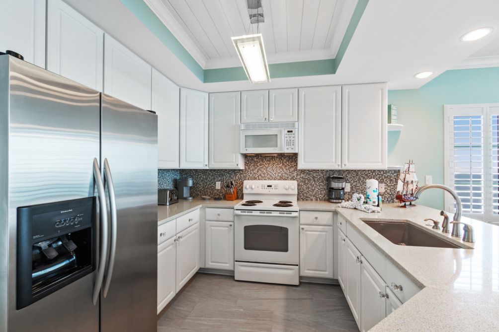 Step inside to a bright, open living space with stylish decor and floor-to-ceiling windows showcasing breathtaking Gulf views. The well-equipped kitchen makes meal prep a breeze, whether you're whipping up a quick snack or a full-course dinner.