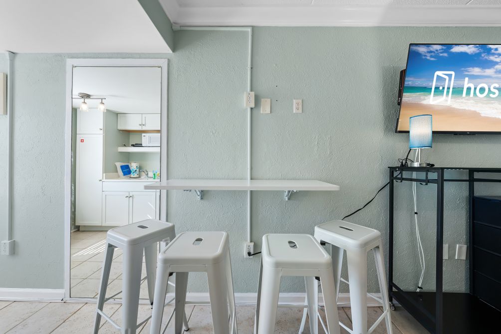 Start your mornings with coffee and light bites at the bar-style seating area for four, equipped with a stainless steel mini-fridge, microwave, coffee maker, and toaster. After a day in the sun, cool off with partial air conditioning and a ceiling fan while enjoying your favorite show on the flatscreen TV. Plus, with access to a shared washer and dryer, keeping your beachwear fresh is a breeze.