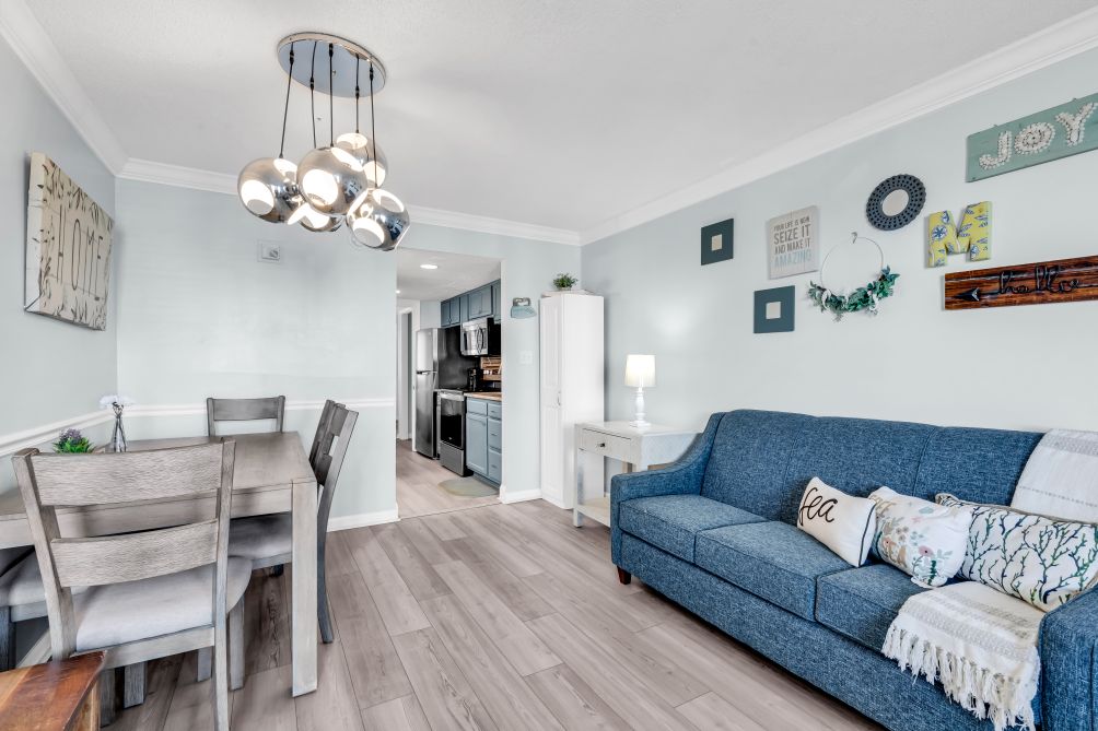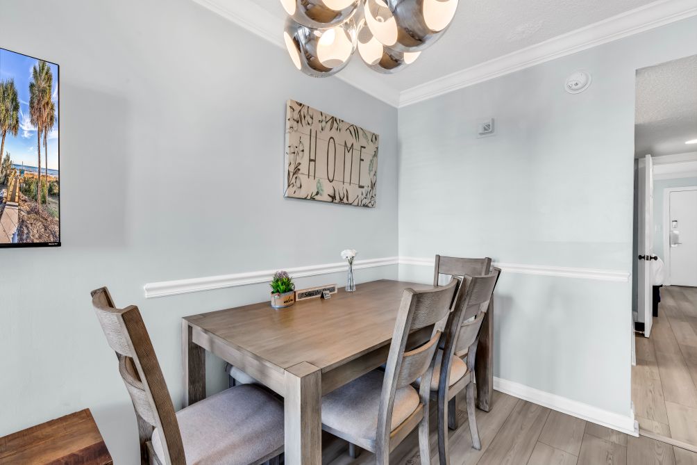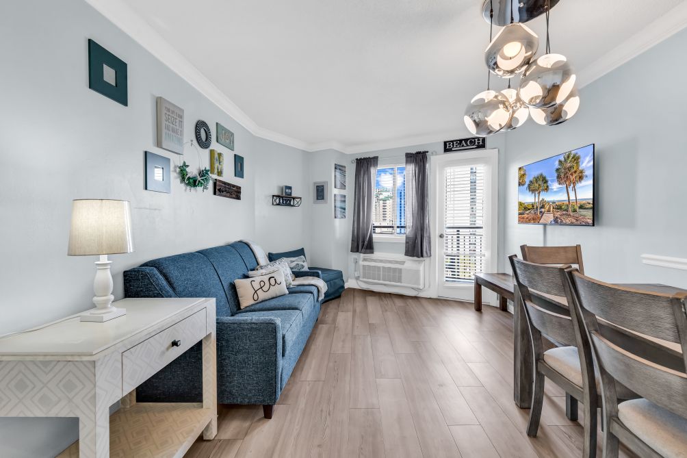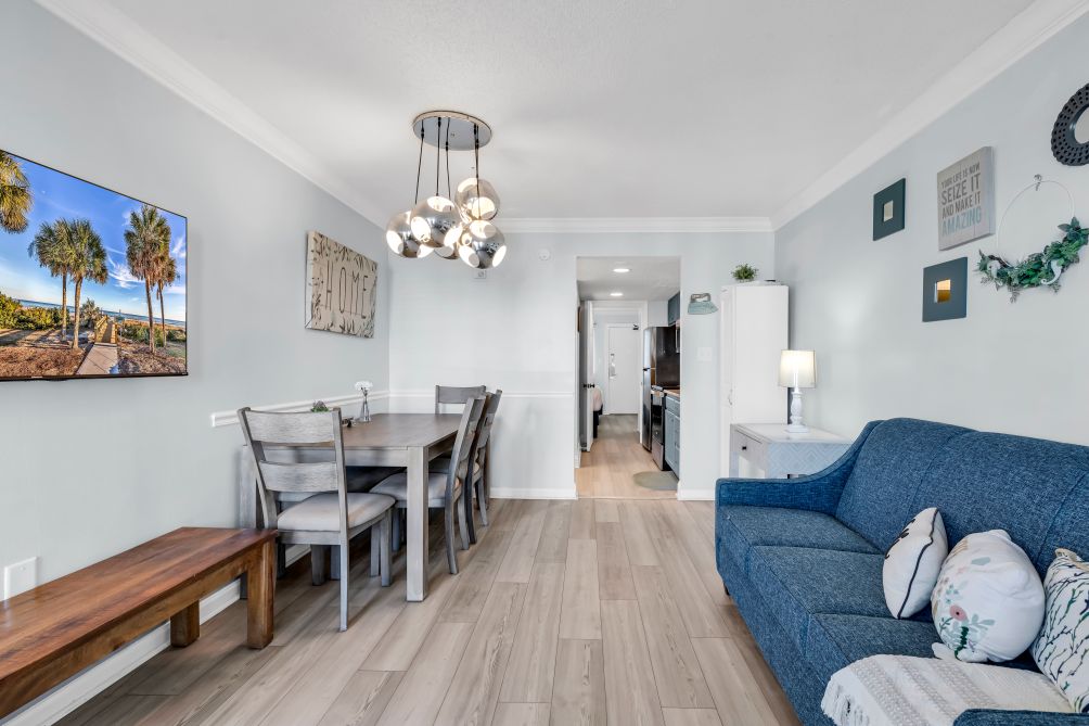 Escape to this charming Myrtle Beach condo, thoughtfully designed for relaxation and ease. The welcoming living area, featuring a smart TV, provides a cozy retreat after a day at the beach. Share meals in the inviting dining space, and take advantage of the well-equipped kitchen to prepare your favorite dishes. Step onto the furnished balcony to enjoy the fresh coastal breeze with a morning coffee or an evening drink.
