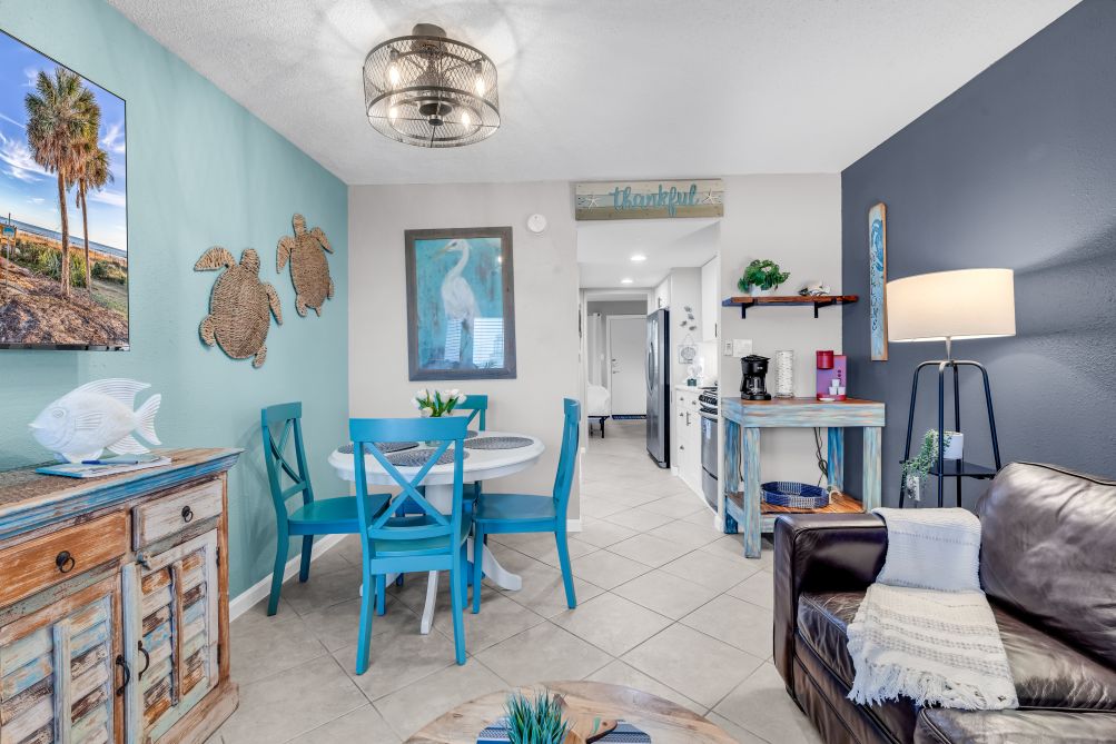 Escape to this inviting Myrtle Beach condo, designed for comfort and convenience. The inviting living room, complete with a smart TV, offers a cozy space to relax after a day of sun and sand. The dining area is perfect for enjoying meals, while the equipped kitchen provides everything you need to whip up your favorite dishes. Step out onto the furnished balcony to soak in the refreshing breeze and unwind with a morning coffee or evening drink.