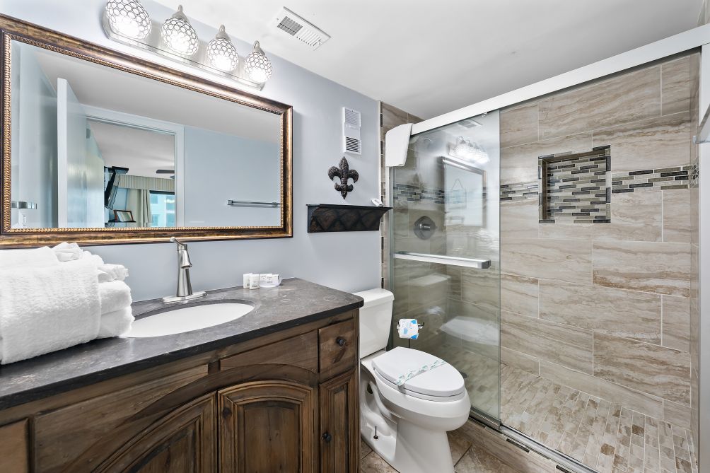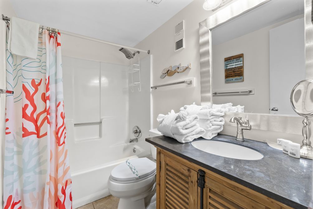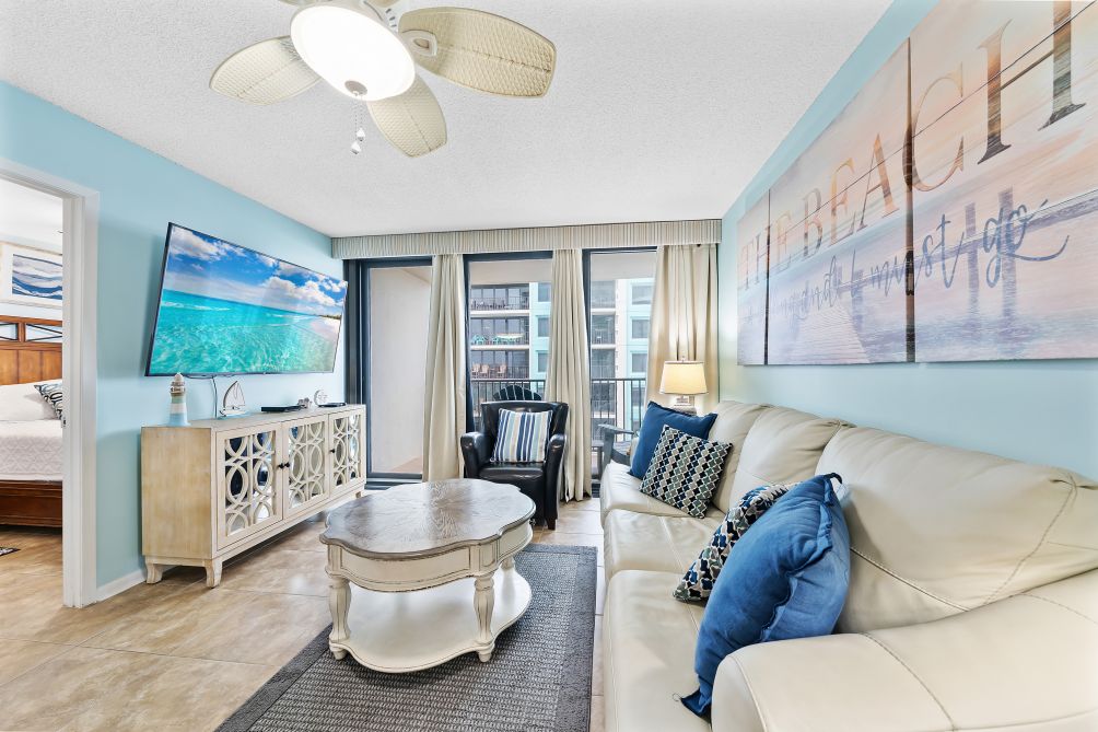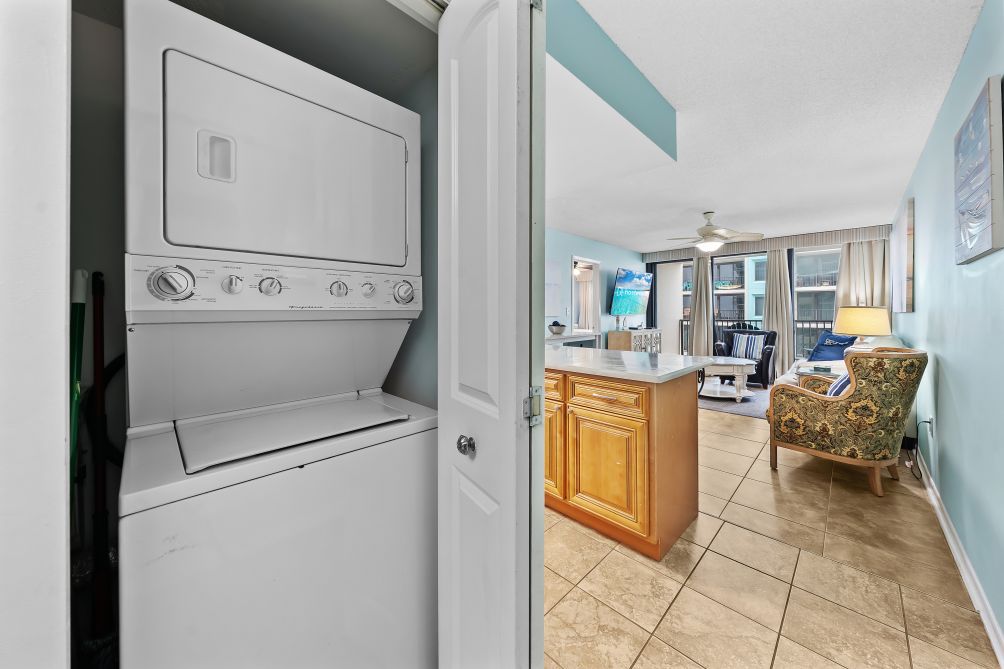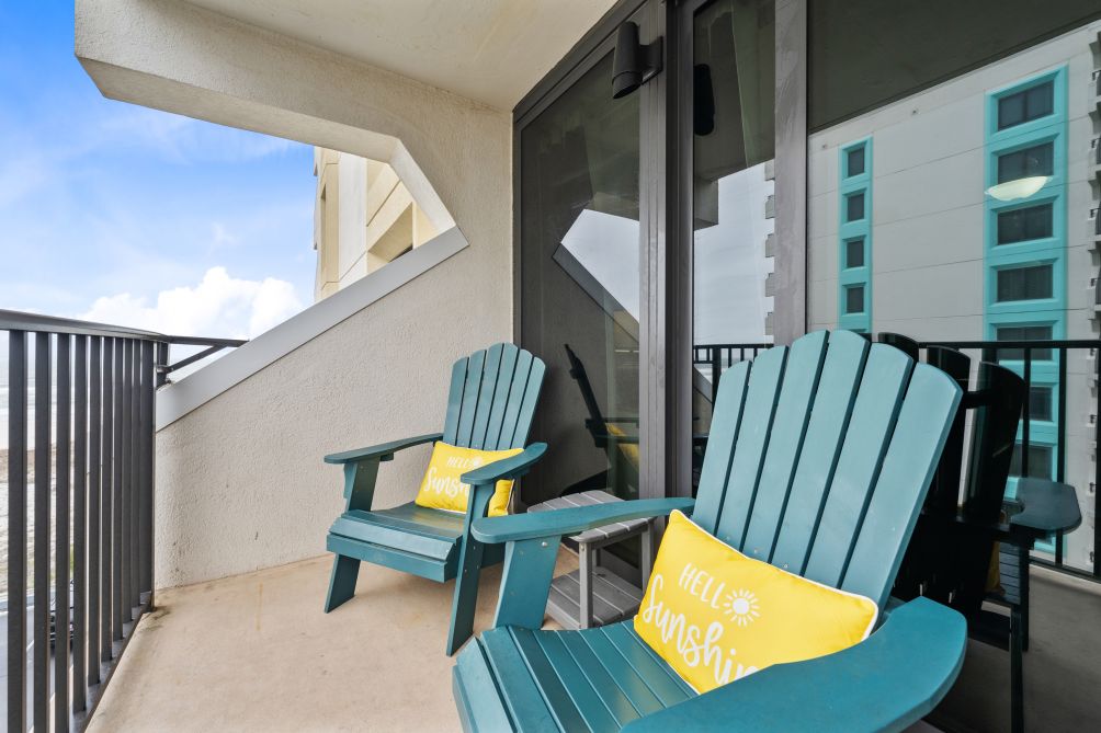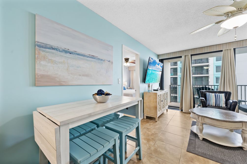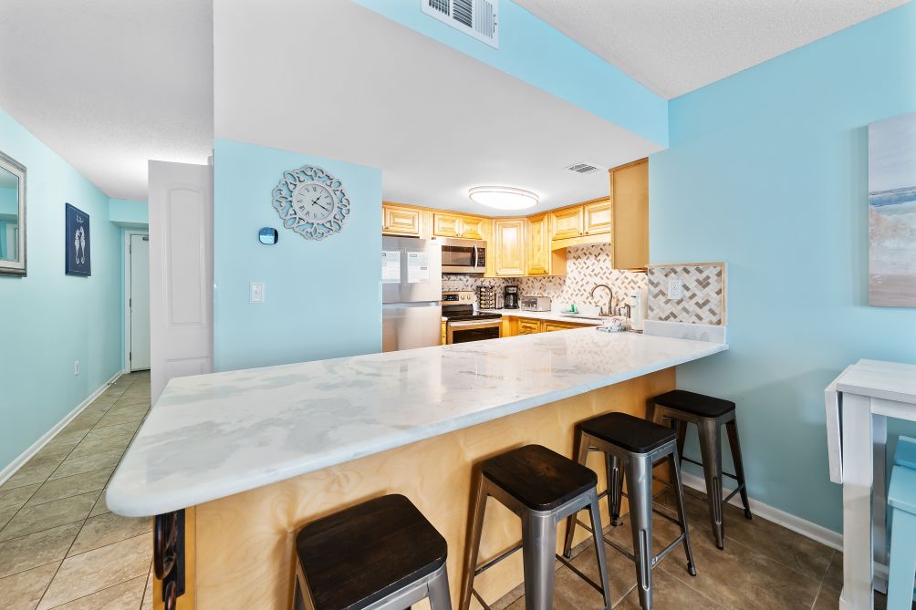 Step inside and enjoy a cozy, coastal-inspired living space with floor-to-ceiling windows and a private balcony, ideal for sipping morning coffee or watching the sunset melt into the waves. The fully equipped kitchen has everything you need to prepare meals after a day at the beach, while the open layout invites conversation and relaxation.