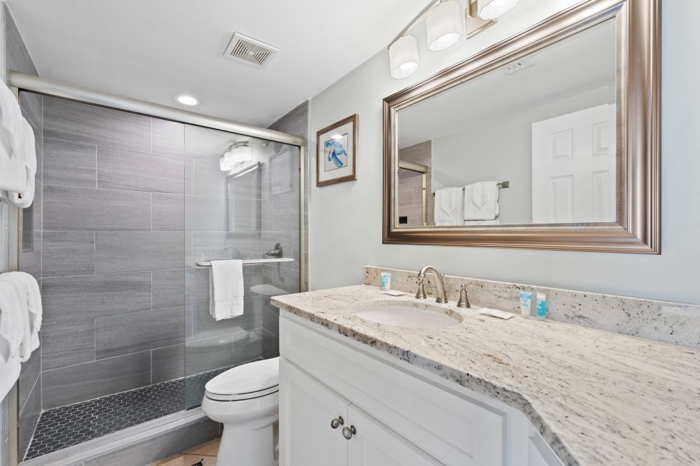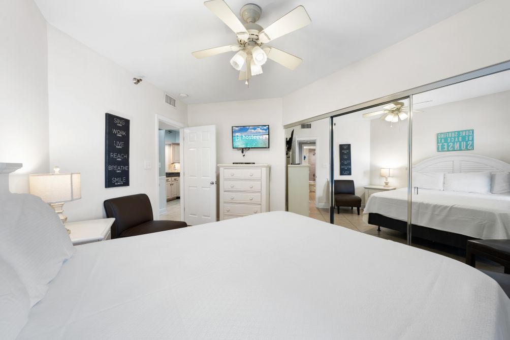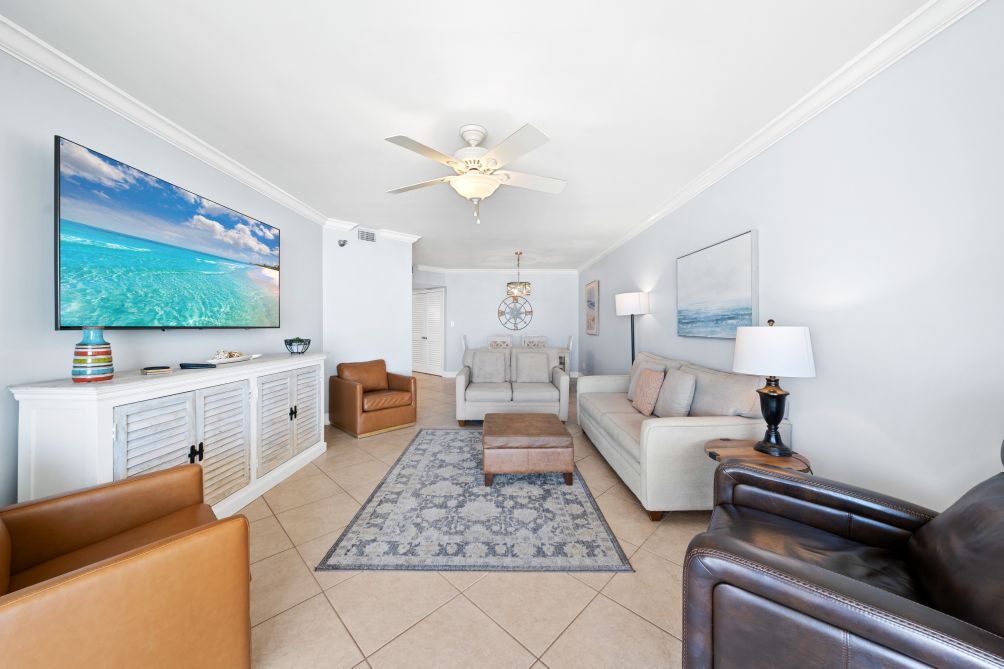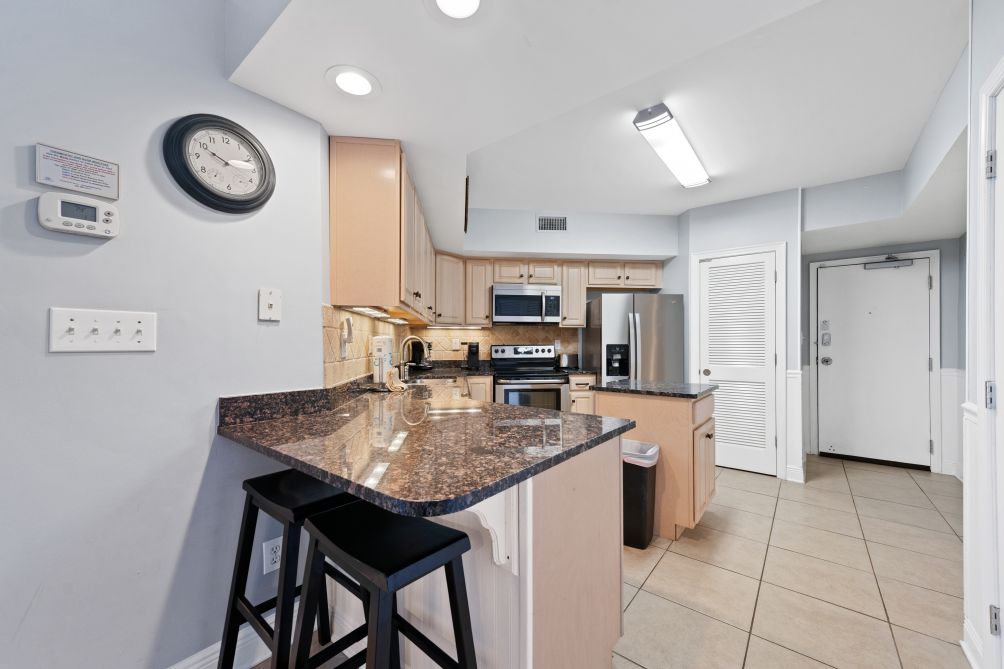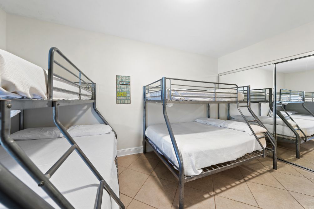 Inside, the condo is thoughtfully designed with comfort in mind. The master bedroom features a king bed, while the second bedroom offers a queen bed, and the third bedroom is equipped with two bunk beds, ideal for families. A sofa bed in the living area provides additional sleeping options.