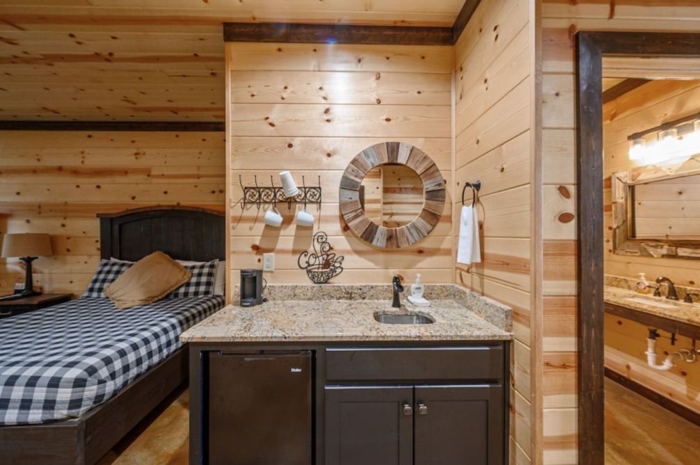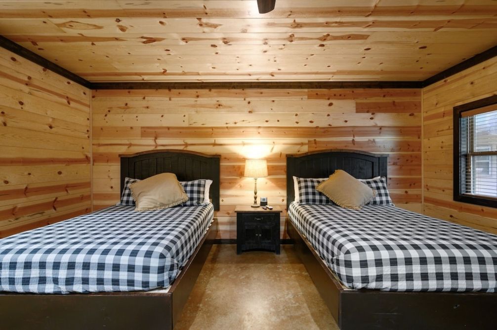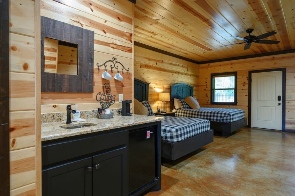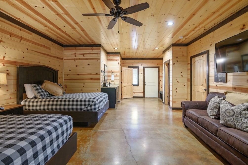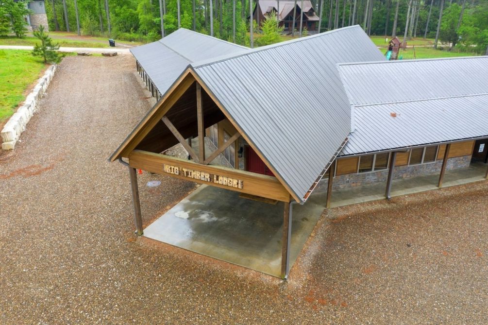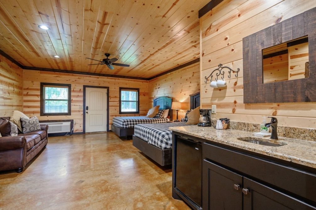 Big Timber Lodge designed to host corporate retreats or events, family reunions, small weddings, etc. This gorgeous 8 bedroom lodge can accommodate all of your guests. One bedroom is handicapped accessible and each room boasts 2 queen beds, a sofa sleeper, a private bathroom, coffee pot, refrigerator, and television. The 1,780 sq ft common area in the center of the lodge is complete with a television to plug your laptop into for corporate meetings, or just for showing off pictures at a family reunion.