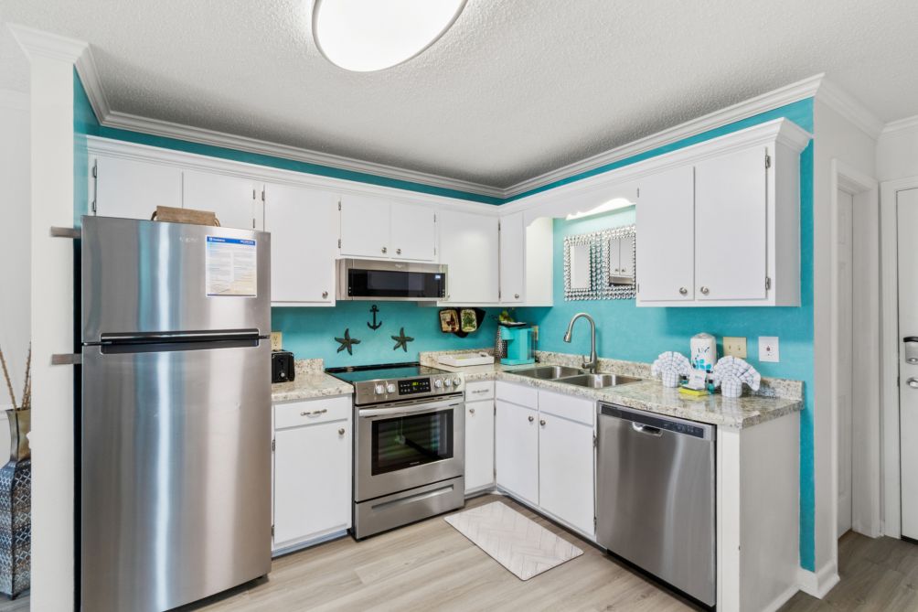 Start your mornings on the balcony, coffee in hand, with the sound of the waves in the background. Inside, the space is bright and airy, with large windows in every bedroom letting in beautiful natural light. The living area features a lovely dining table, perfect for a cheerful breakfast or a cozy evening meal together. The condo also features a well-equipped kitchen, perfect for preparing quick snacks or full meals during your stay.