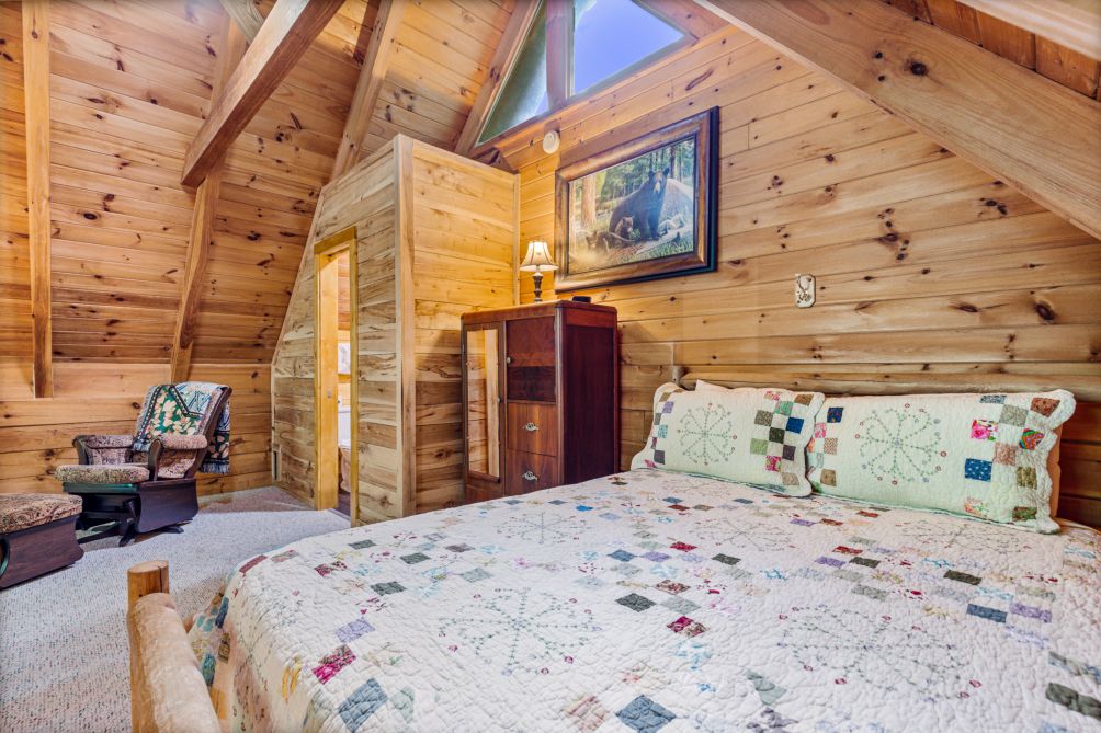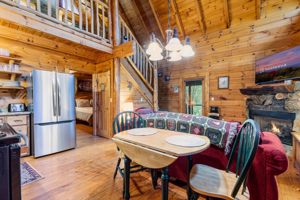 Step inside to a warm, rustic interior featuring rich wood finishes, vaulted ceilings, and large windows that bring the outdoors in. The living area offers a plush seating arrangement around a stone fireplace—perfect for chilly mountain evenings or curling up with a good book. The fully equipped kitchen has everything you need to prepare home-cooked meals, while the dining area offers a cozy spot to gather and share stories.