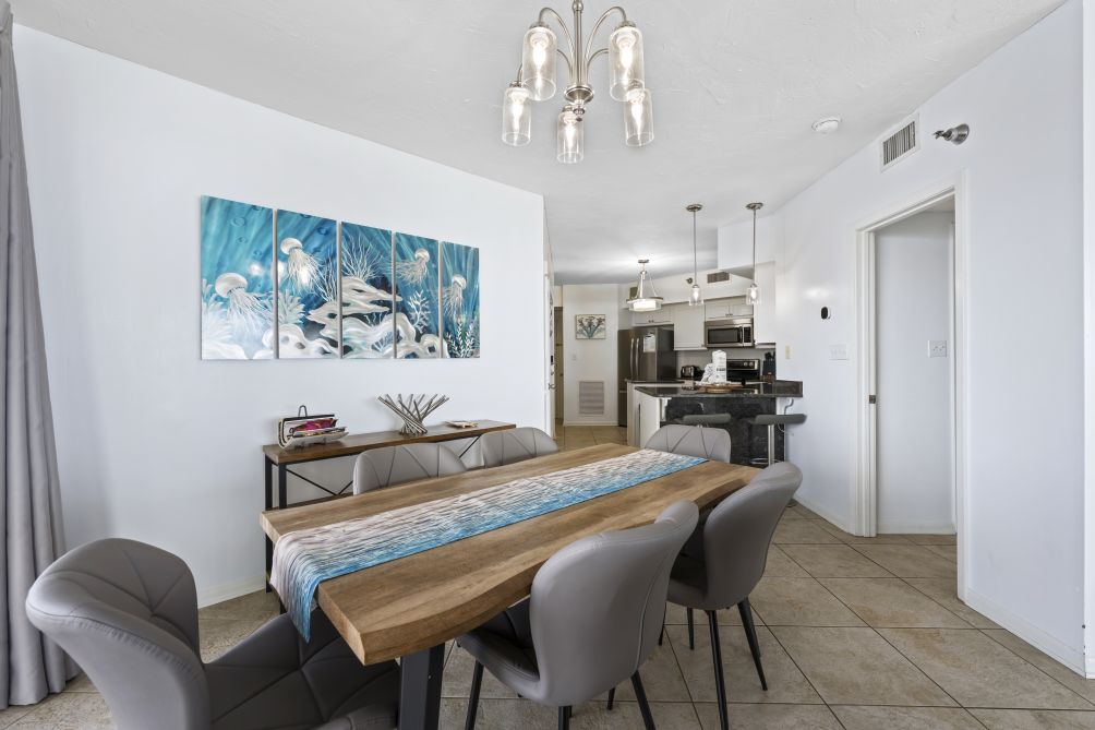 Inside, the unit boasts elegant tile and marble flooring, creating a luxurious ambiance. The fully equipped kitchen is a culinary enthusiast's dream, complete with modern appliances and all the essentials for preparing gourmet meals. The dining area is perfect for intimate gatherings, while the cozy living room provides a serene space to unwind after a day at the beach.