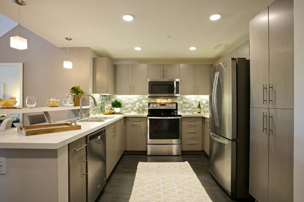 Each unit includes stylish residential features including an in-home Whirlpool® appliance package, full-sized washer and dryer, oversized walk-in closets, kitchens with quartz countertops and contemporary cabinets, blackout window shades, wood plank-style flooring, USB charging stations, bathrooms with quartz countertops, and more.