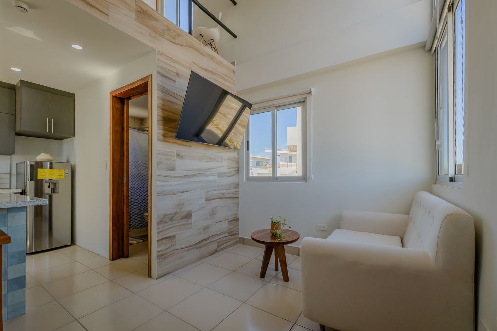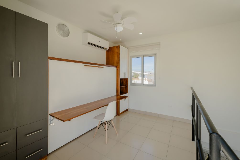 Another excellent option in our Eva Halcon home features a comfortable and practical Murphy bed on the second floor with direct access to the terrace. This intelligently designed Murphy bed efficiently utilizes the space, transforming into a work area with a ready-to-use desk, ideal for balancing work and life. The first floor includes a bathroom, a fully equipped kitchen, and a Smart TV for your entertainment. The home is powered exclusively by solar panels and is ideal for couples.