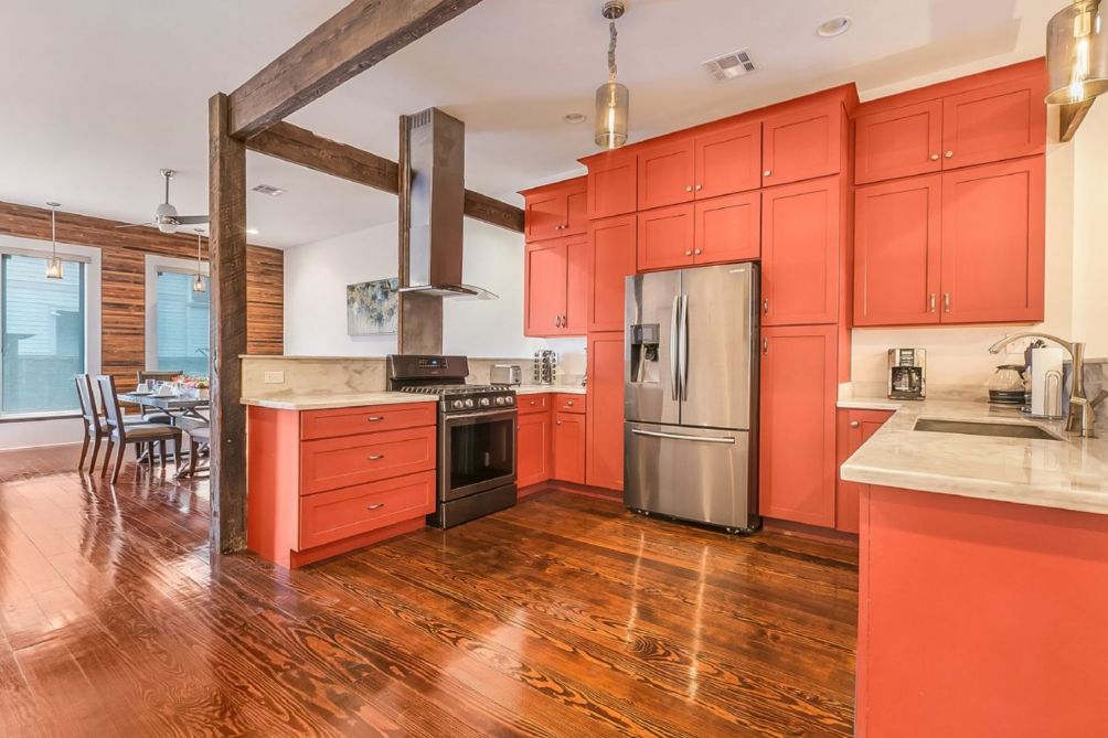 This spacious 2 levels 3 Bedroom 2.5 bath Carondelet St. residence is newly renovated and features a modern design, custom-built furniture, and wood accent feature all throughout the house, including modern wood accent walls in the living areas and bathroom amenities.