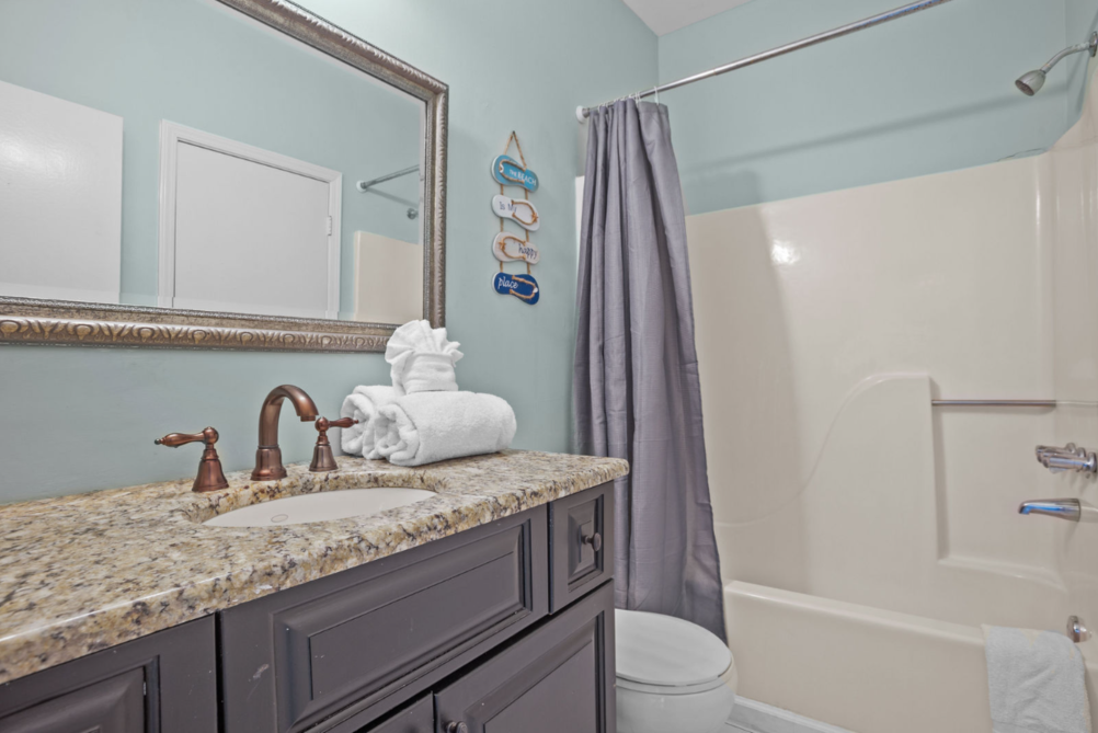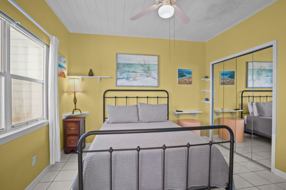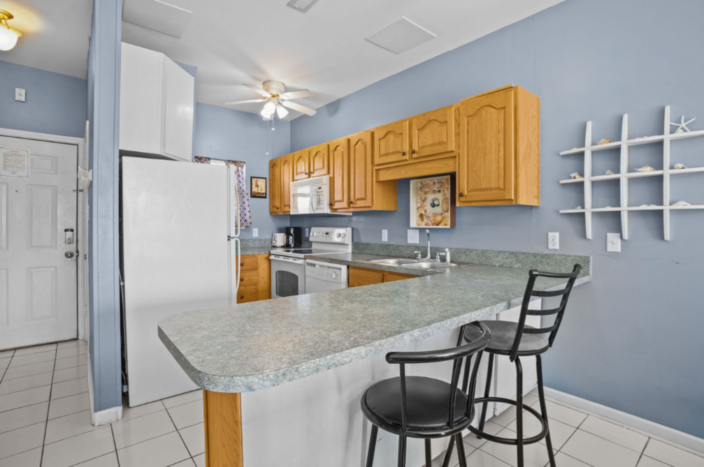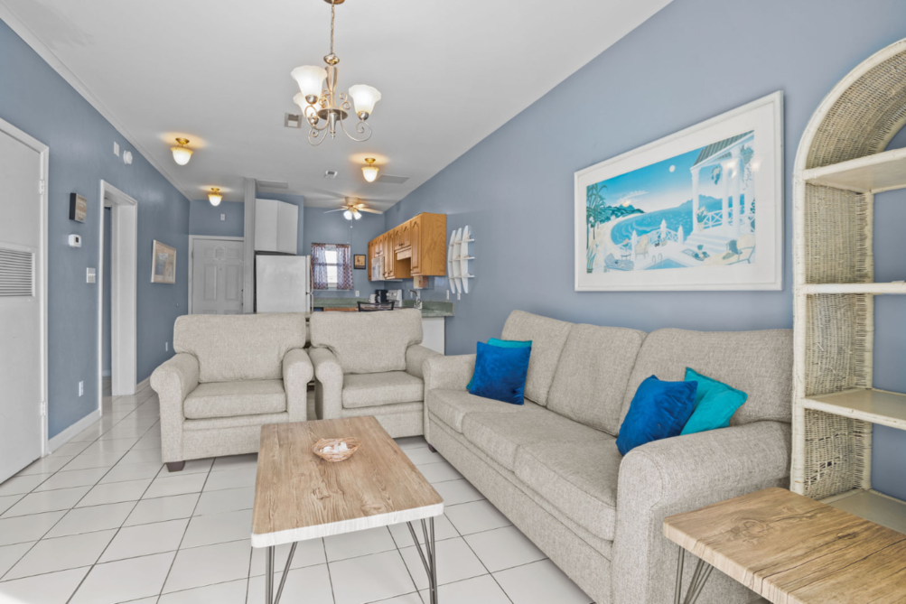 The interior is thoughtfully designed, featuring a spacious living area and a fully equipped kitchen to meet all your culinary needs. Each bedroom is furnished with a cozy queen bed, ensuring restful nights after a day of beachside adventures.