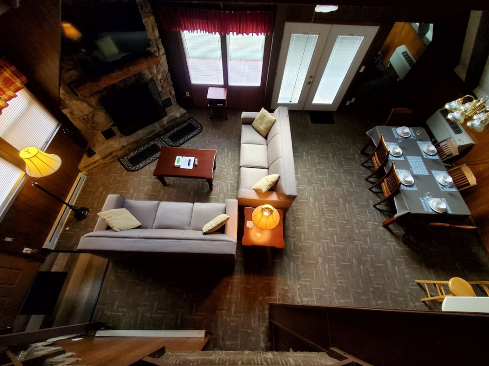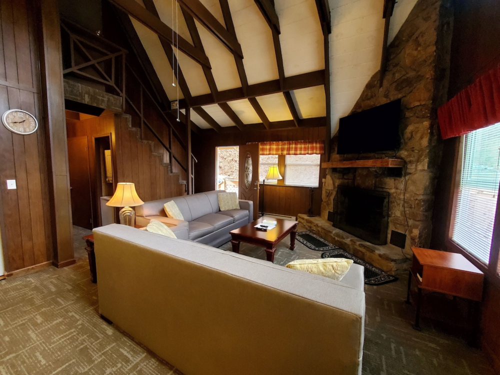Relax in the spacious living area featuring a cozy stone fireplace and a smart TV, unwind on the private balcony with forest views, or prepare meals in the fully equipped kitchen. Each bedroom offers plush bedding for a restful night’s sleep, while the bathrooms are stocked with essentials to make your stay effortless.