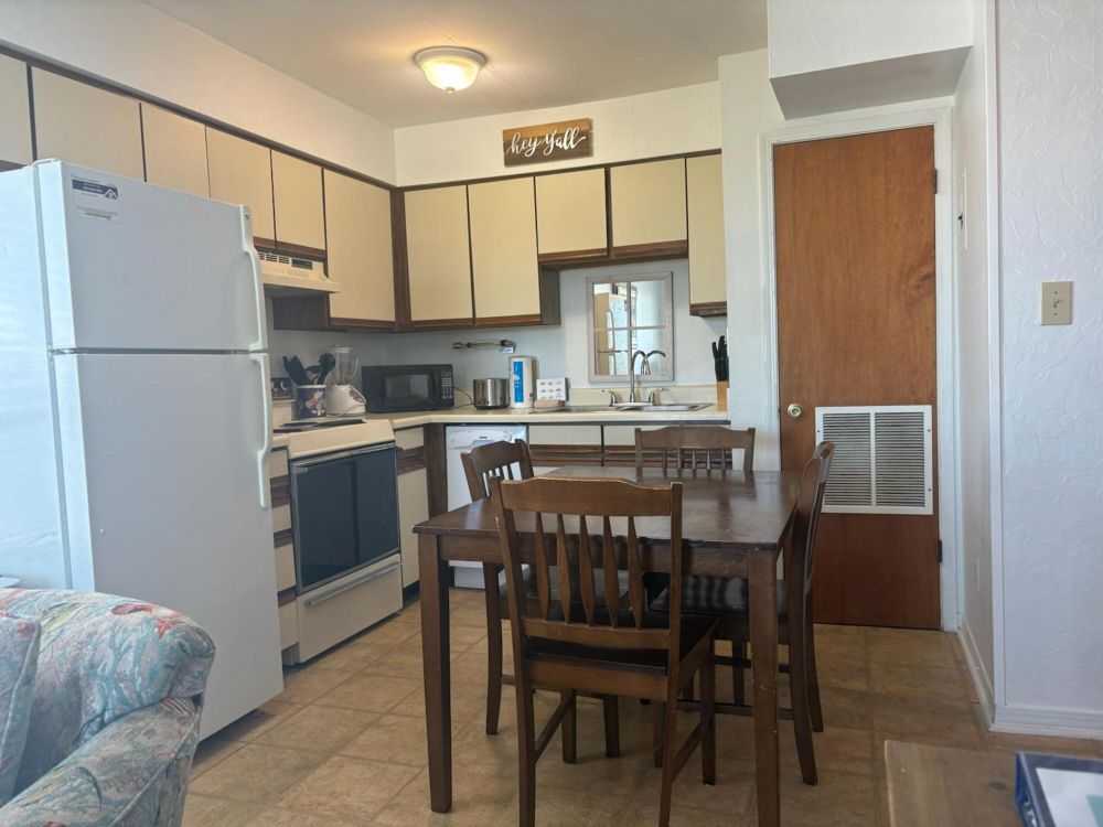 Step into a bright and airy living space designed for comfort, complete with plush seating and a flat-screen TV—ideal for winding down after a fun-filled day by the Gulf. The open layout connects to a fully stocked kitchen, where you can whip up anything from quick snacks to full meals with ease, then gather around the dining area to enjoy them together.