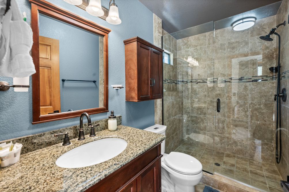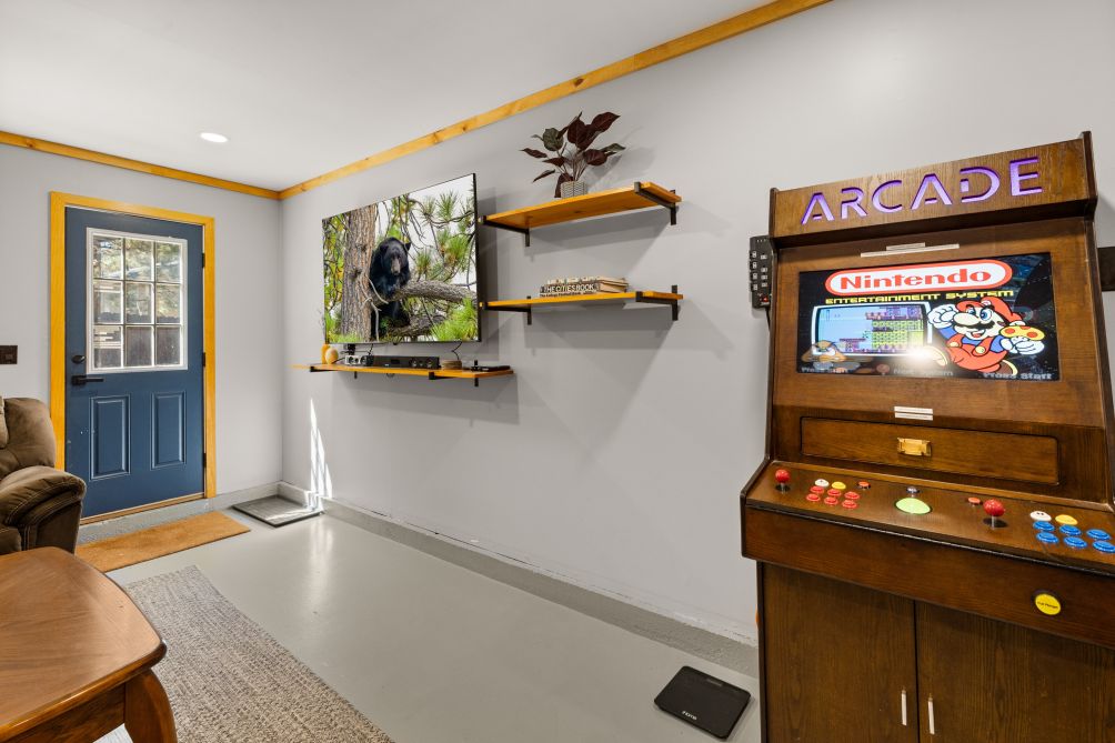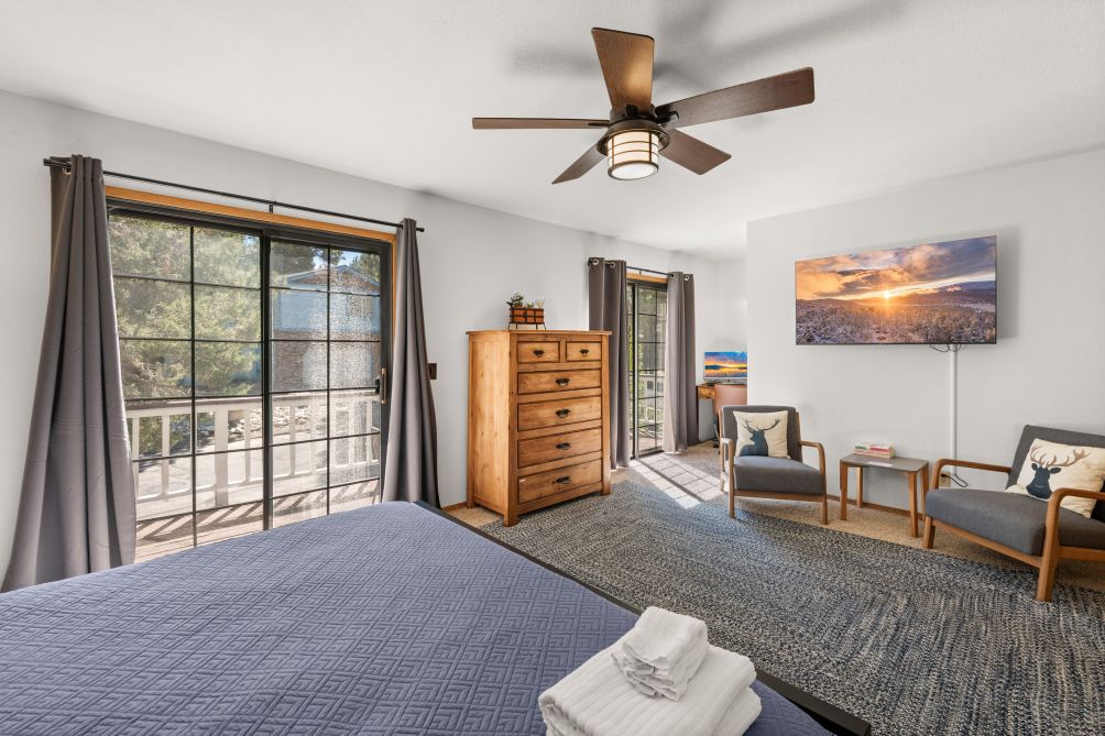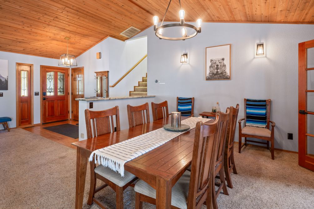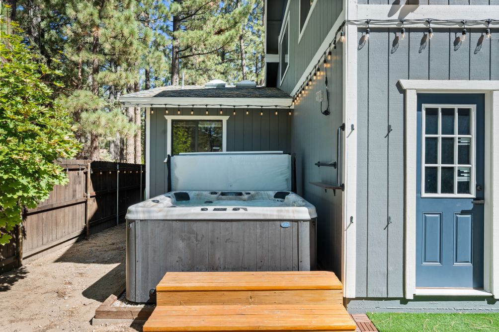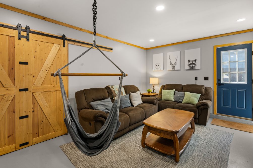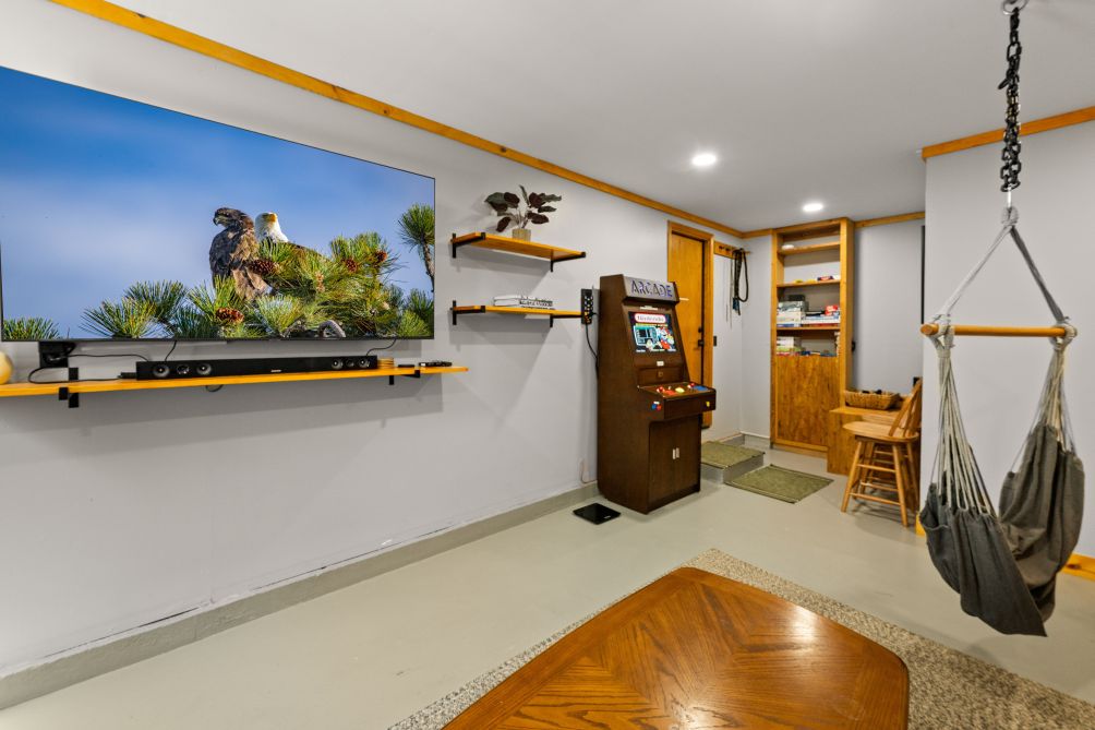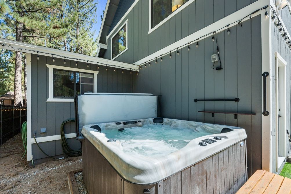 Outside, the spacious backyard invites you to unwind and enjoy the stunning surroundings. Soak in the hot tub under the starry sky, gather around the fire pit with string lights for a cozy evening, or relax in the outdoor seating area and bask in the sun. In the winter, the property offers on-site snow play for kids, while in the warmer months, it transforms into the perfect spot for outdoor games and relaxation
