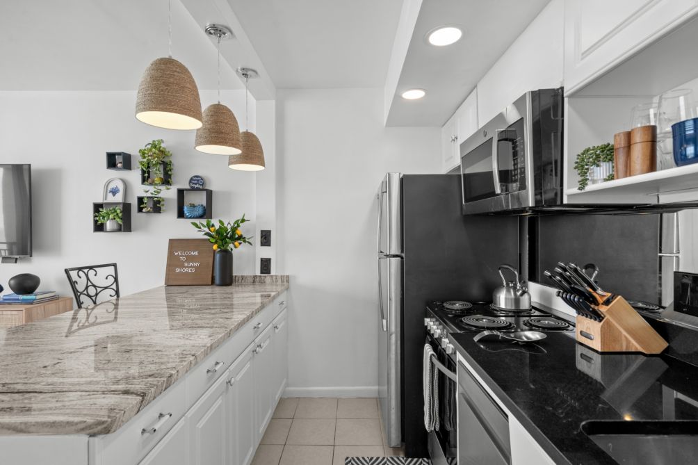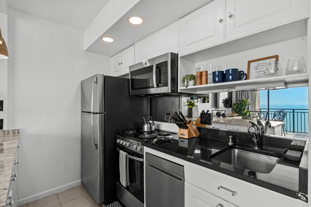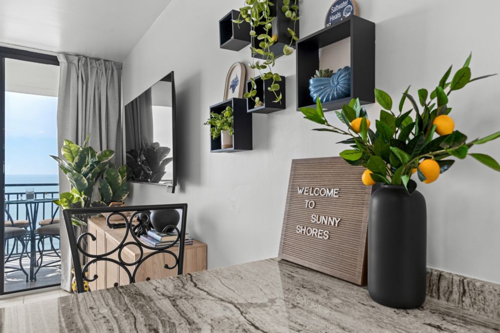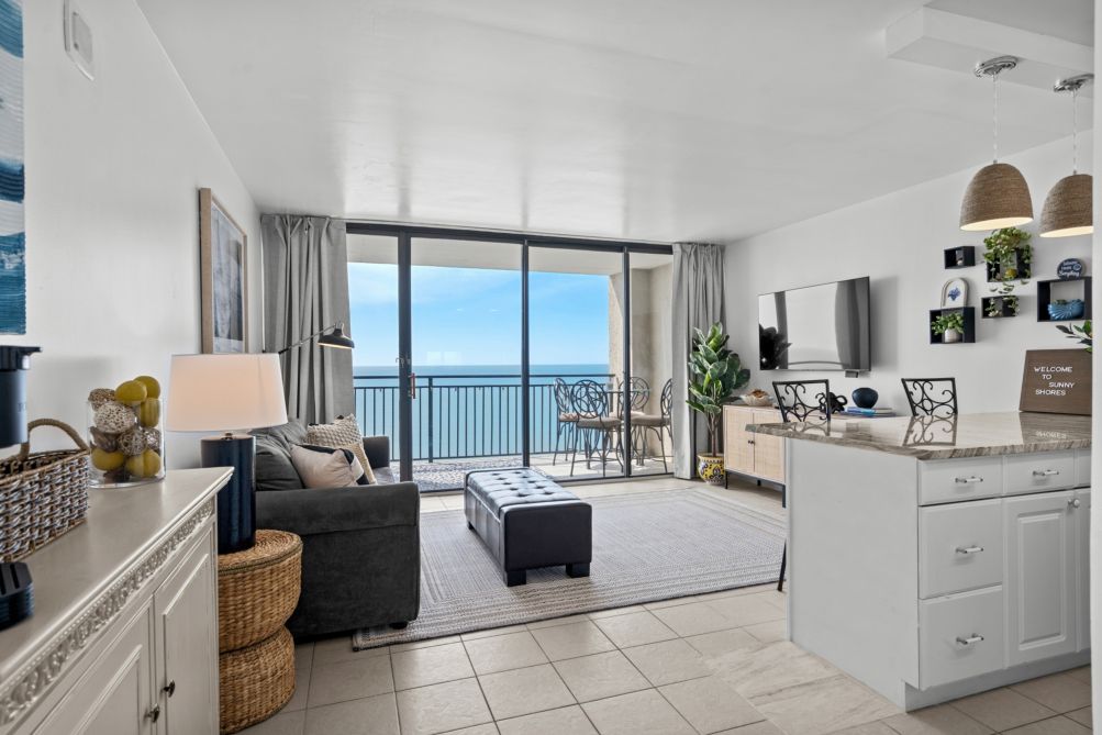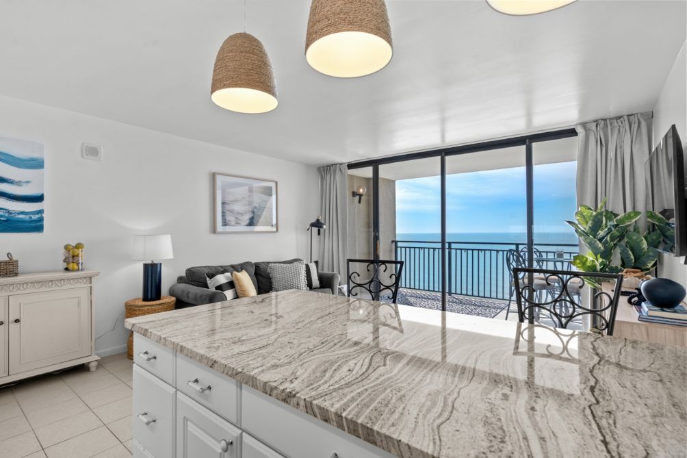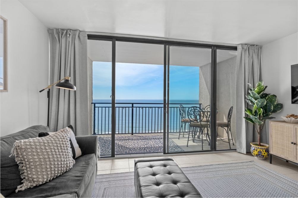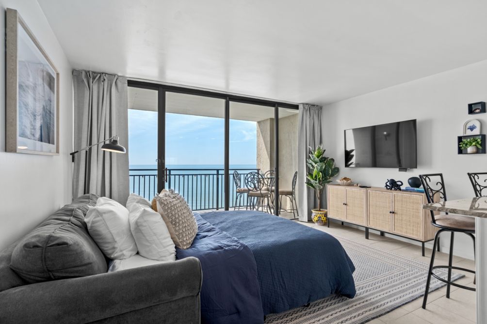 Step into a relaxing escape where comfort meets convenience. The private balcony is the perfect spot to sip your morning coffee while gazing at the endless horizon or unwind in the evening as the sun sets over the Atlantic. From the 16th floor, enjoy a truly panoramic view of the coastline, offering a sense of tranquility like no other. The open living area invites you to relax with plush seating, a brand-new sleeper sofa, and a large TV for your entertainment needs. Whether you're enjoying a quiet night in or catching up on your favorite shows, you'll feel right at home.