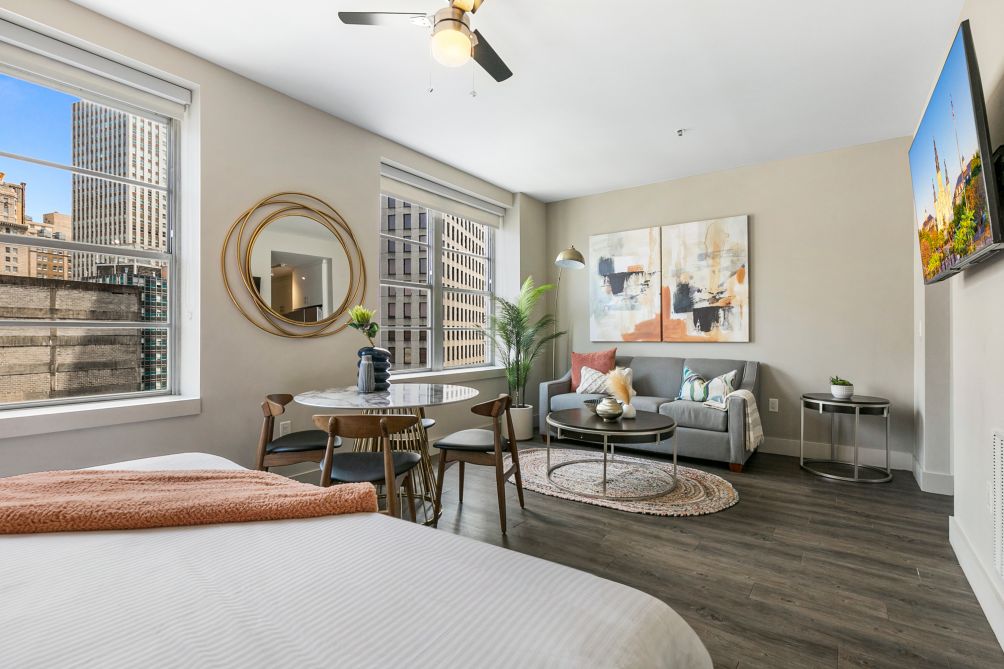 This elegant and spacious 1 bedroom condo comes equipped with an amazing city view from the rooftop where you can enjoy your morning coffee or an afternoon cocktail, modern design with high ceilings, full kitchen and bathroom amenities, bedroom with walk-in closet, a full bathroom and a spacious living room with a soft pull out sofa.