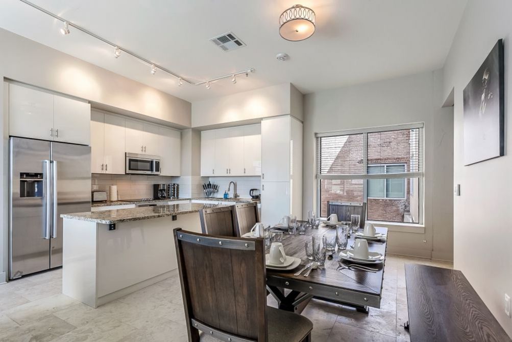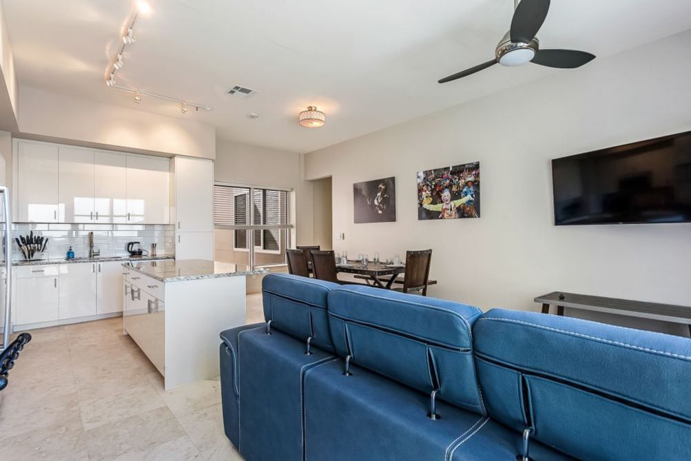 This elegant and accessible penthouse features a modern open layout with high ceilings, a fully equipped state-of-the-art kitchen, stylish living and dining areas, and a cozy pull-out sofa for guests. The master bedroom includes a walk-in closet and the bathroom is designed for accessibility and comfort. Enjoy breathtaking city views from your private terrace—perfect for sipping your morning coffee or unwinding with an evening cocktail.