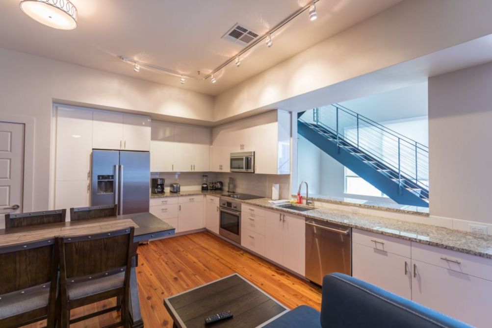 The penthouse features two levels with a living/dining room and a fully functional state of the art kitchen on the first level and bedrooms on the second level. The spacious terrace with NOLA skylines allows for a great small gathering of friends or a sunset watching for 2 on that special date night.