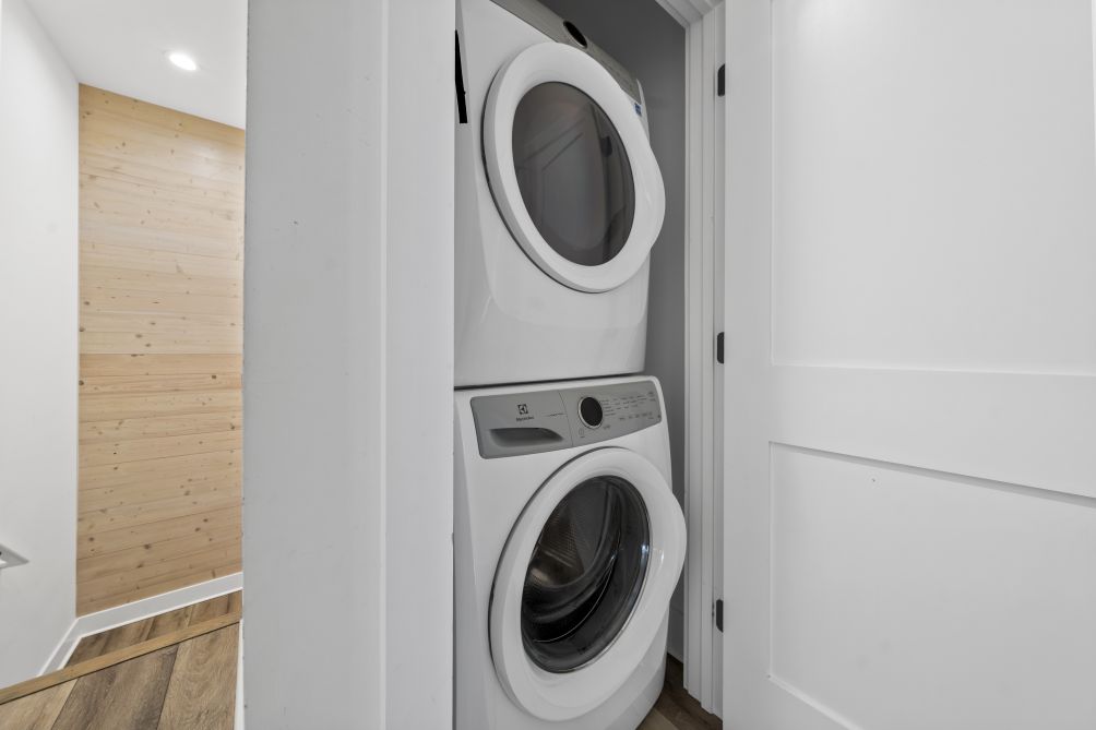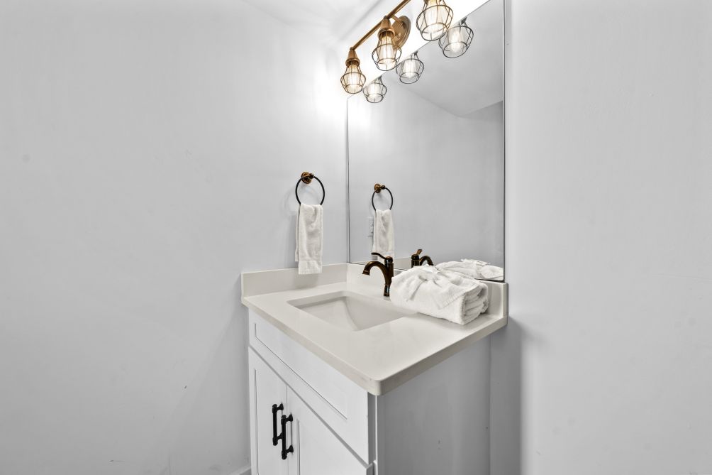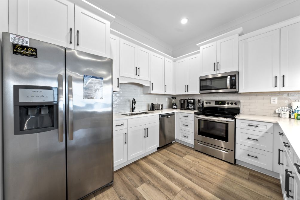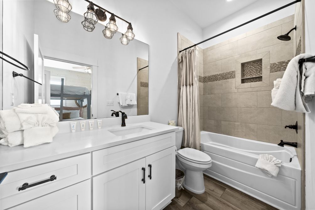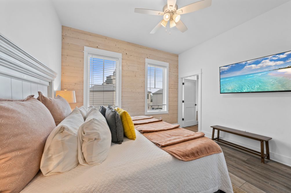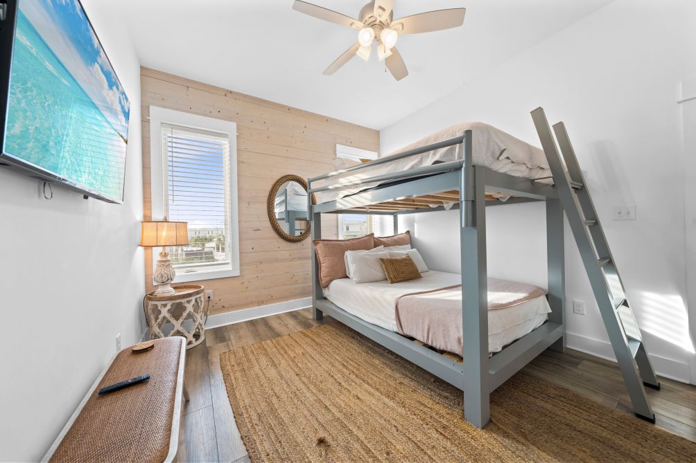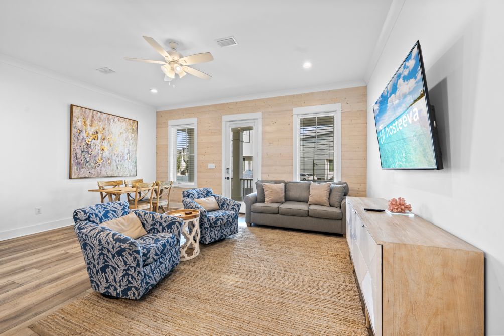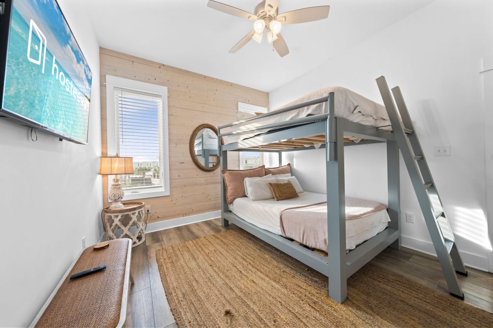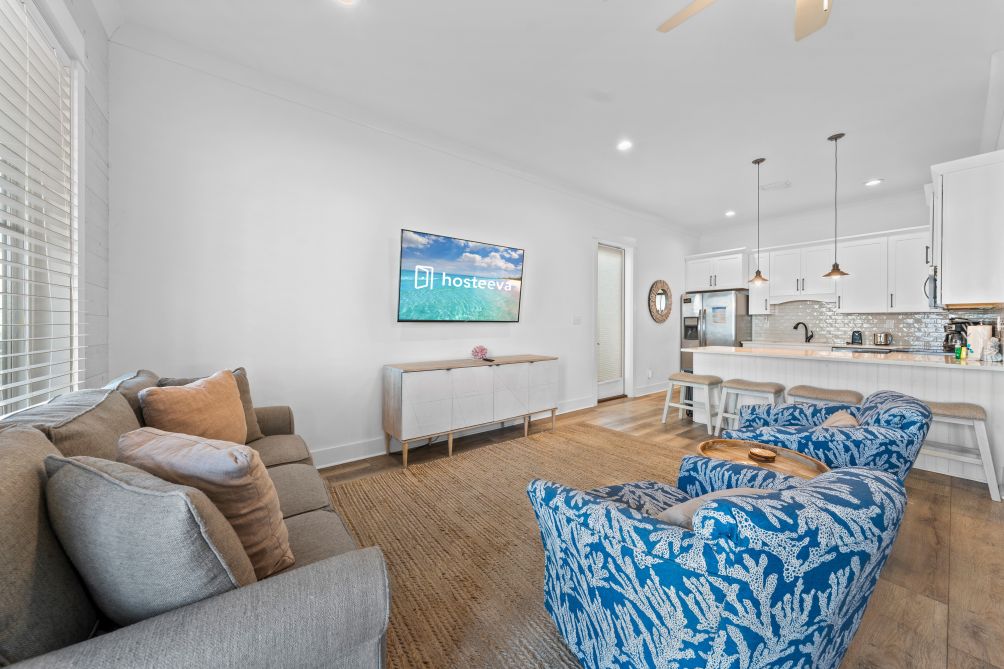 Inside, you’ll find a fully equipped kitchen with stainless-steel appliances, quartz countertops, and a breakfast bar for two — ideal for morning coffee or easy meals. The open-concept living area features shiplap walls, cozy seating, and a smart TV, creating a welcoming space to relax after a fun day at the beach or pool. Gather around the dining table for family dinners, board games, or late-night snacks.