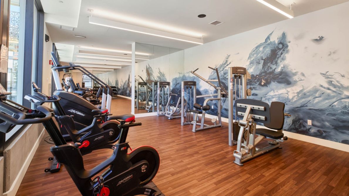 Guests have access to premium community amenities, including a fitness center and outdoor lounge.