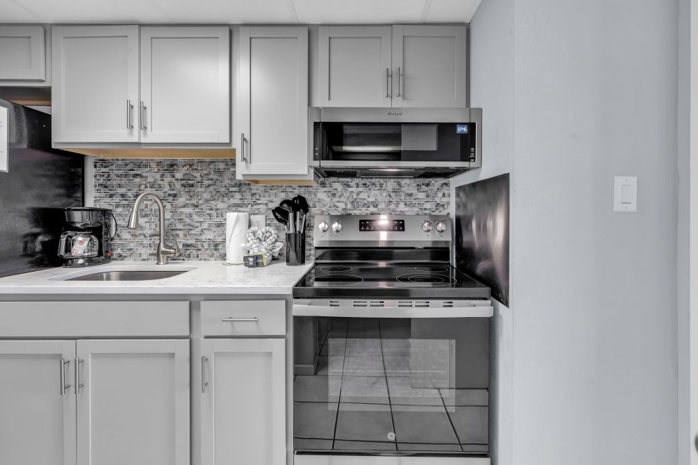 The fully equipped kitchen features sleek appliances and ample counter space, making it easy to prepare your favorite meals.