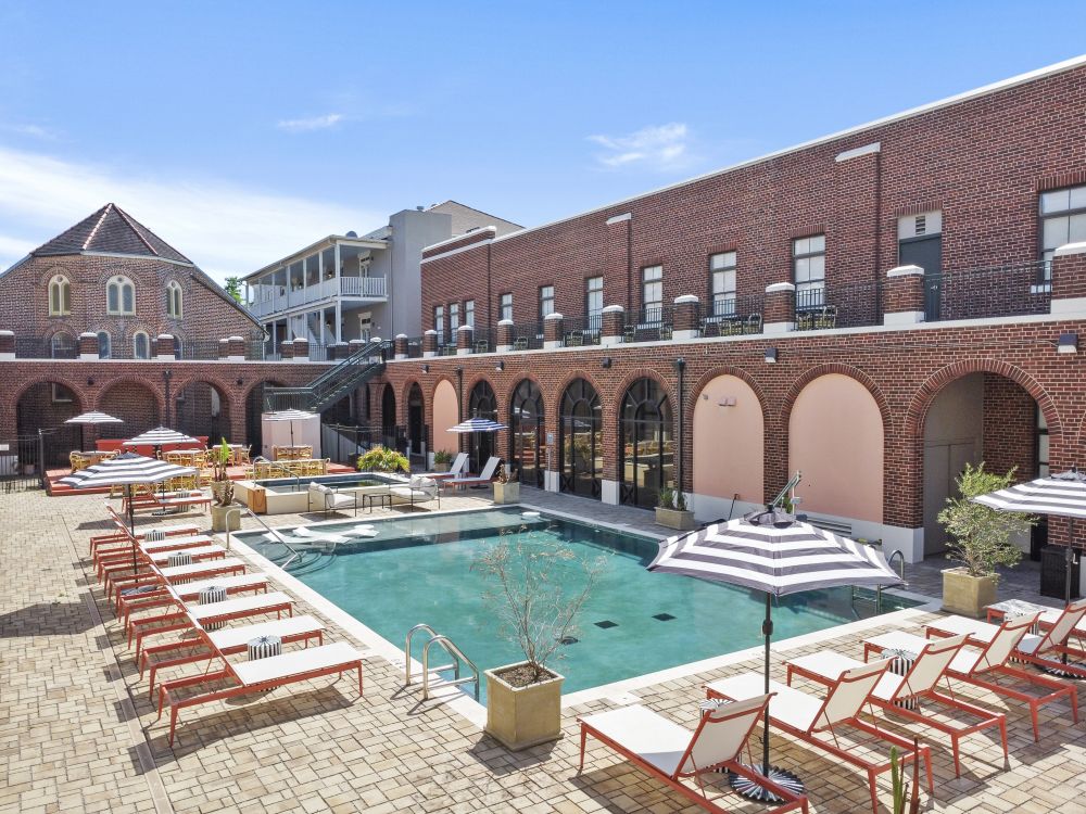 Outside, enjoy the property's community amenities, including a refreshing outdoor pool, peaceful seating areas, and a lush courtyard. It’s the perfect spot to sip a drink and soak in the tranquil surroundings before diving into the city’s vibrant nightlife.