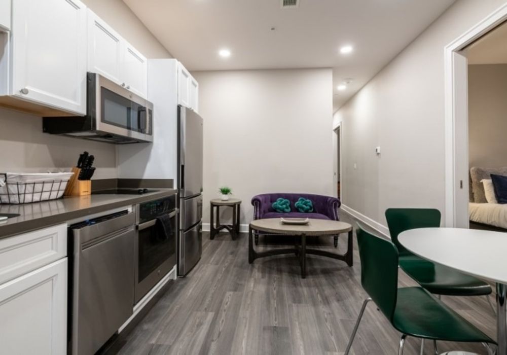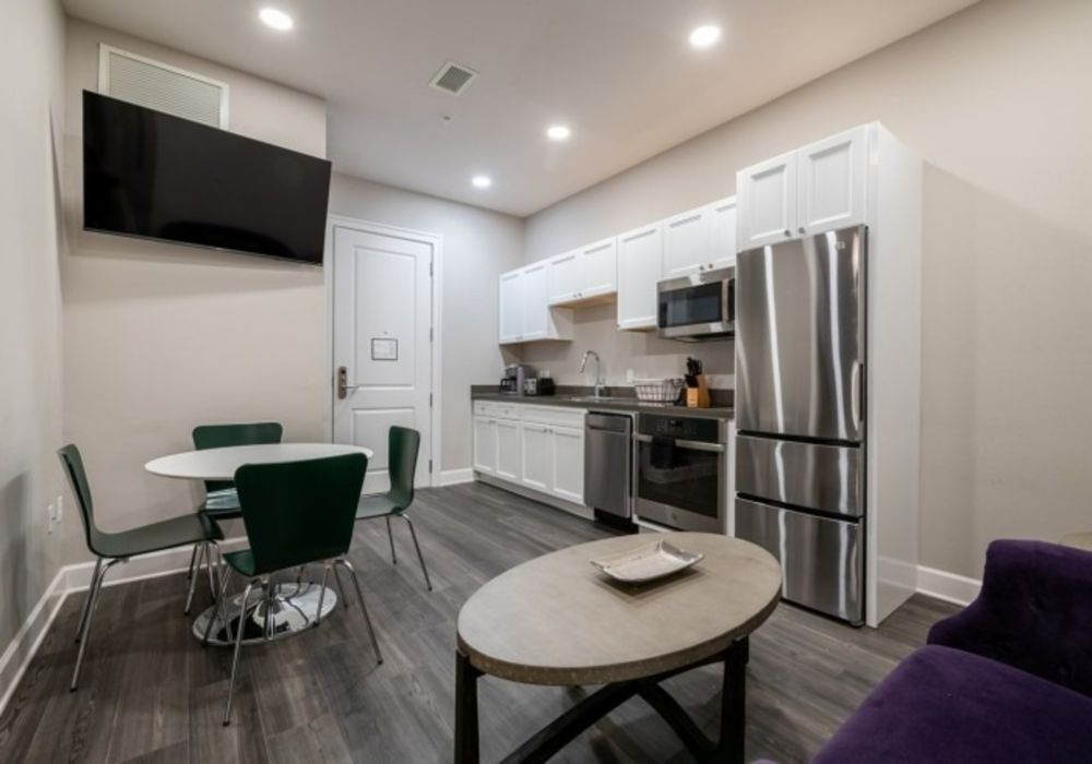 Outside, enjoy the property's community amenities, including a refreshing outdoor pool, peaceful seating areas, and a lush courtyard. It’s the perfect spot to sip a drink and soak in the tranquil surroundings before diving into the city’s vibrant nightlife.
