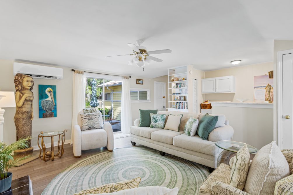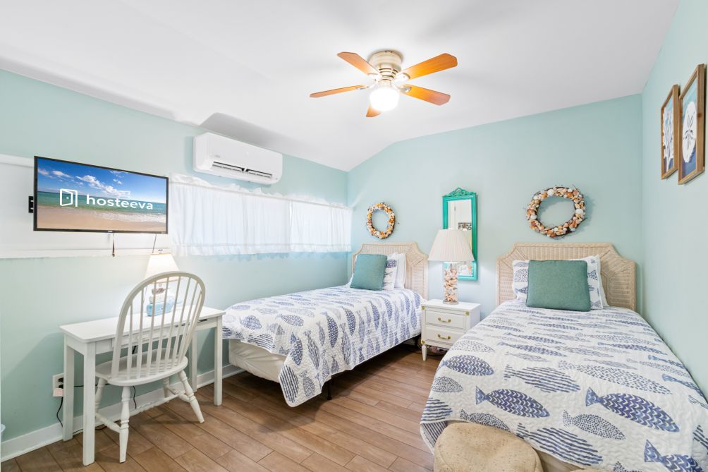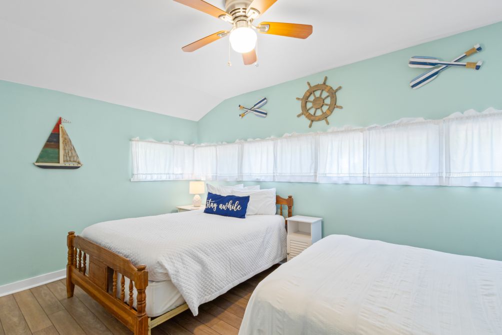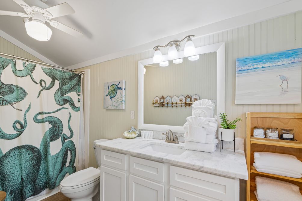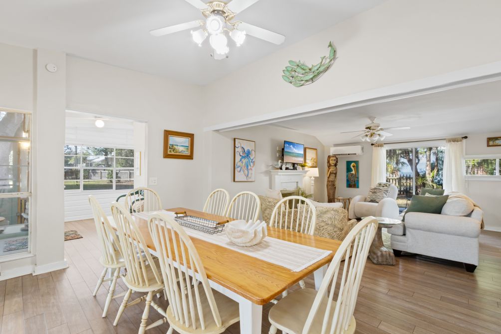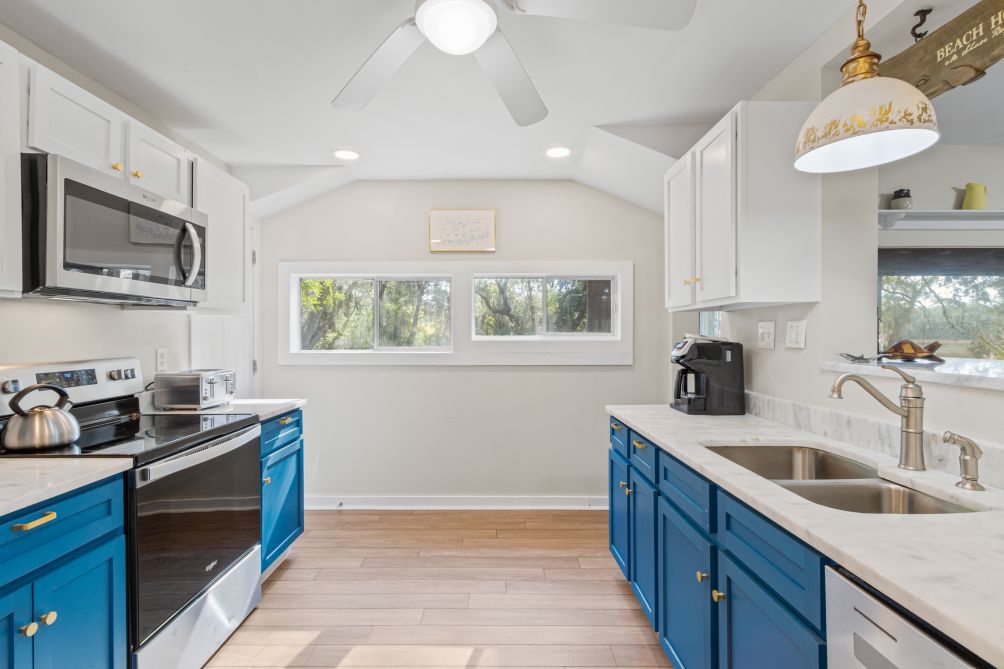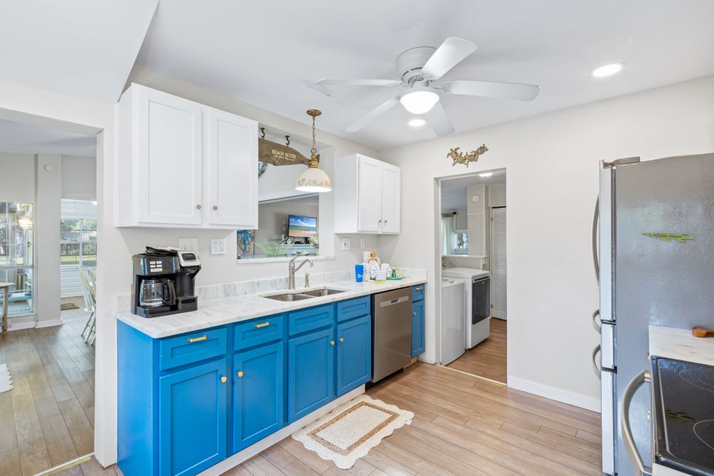 Inside, the cottage features three bedrooms and two baths, comfortably sleeping up to eight guests. Following recent renovations after Hurricane Sally, you’ll enjoy a modern kitchen, new flooring, updated bathrooms, fresh furnishings, and ceiling fans throughout. The ground-level layout makes it easily accessible for all ages.