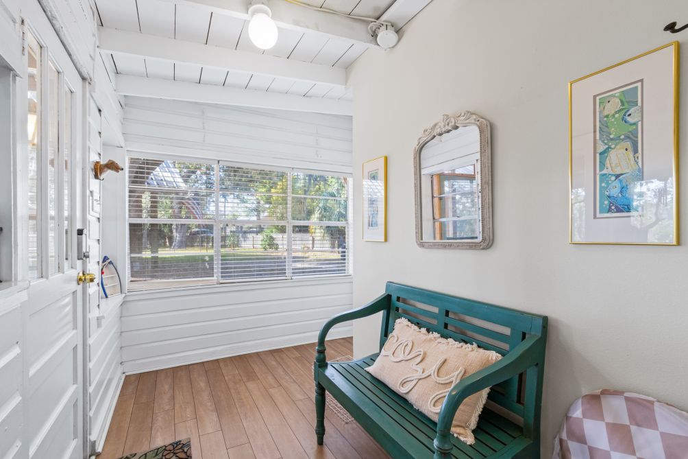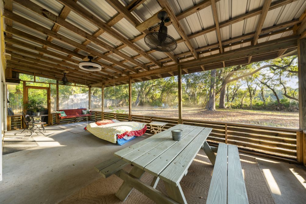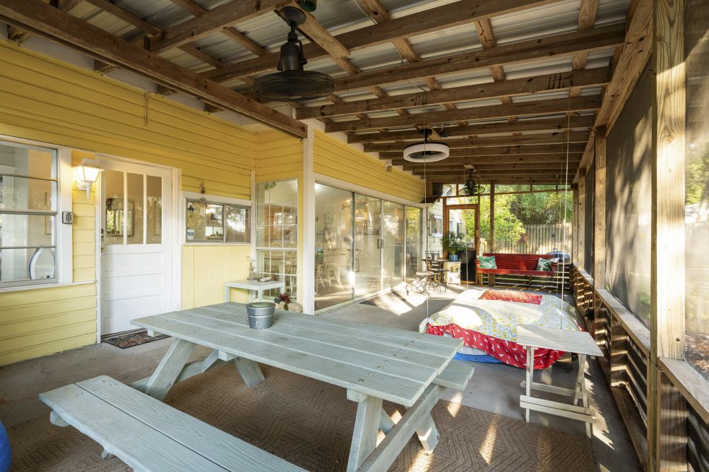Out back, a fenced yard provides a safe space for kids or pets to play, while the screened-in porch with a swinging bed invites lazy afternoons and cozy evenings.