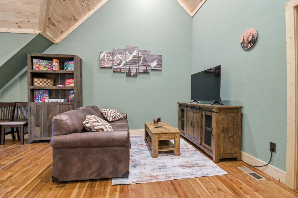 Open-concept living area with cozy seating, large TV, and an inviting mountain-cabin feel