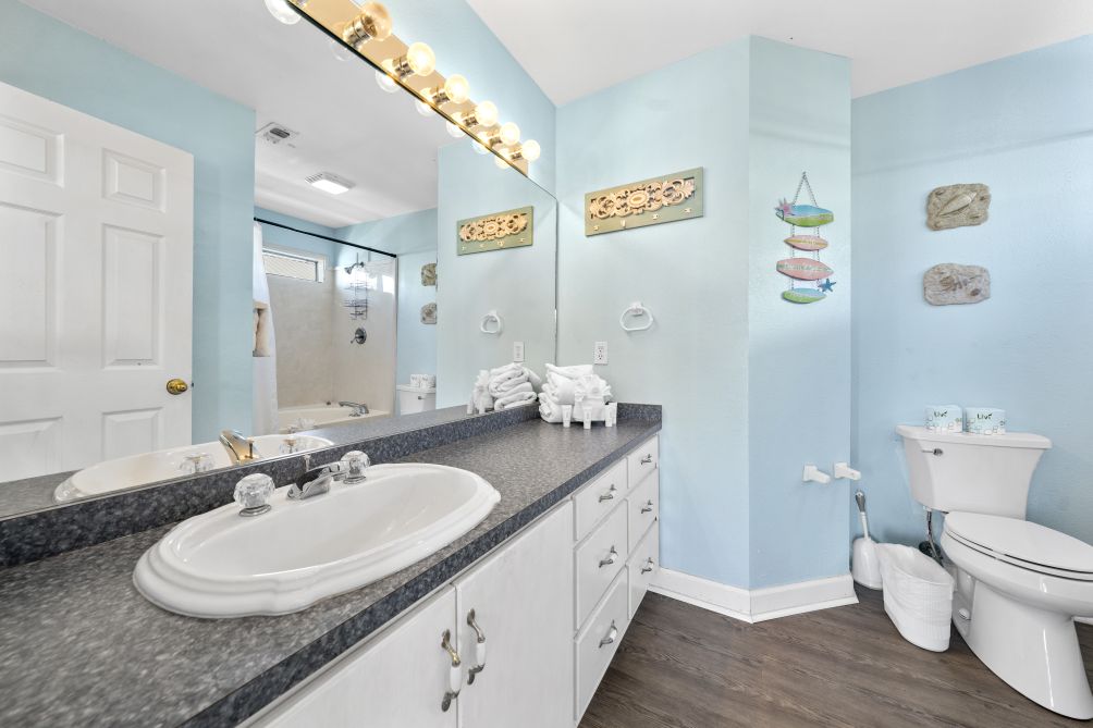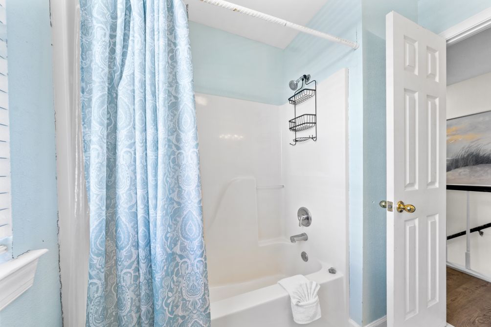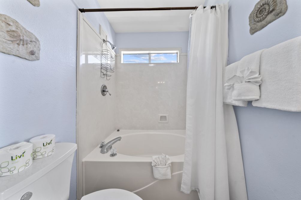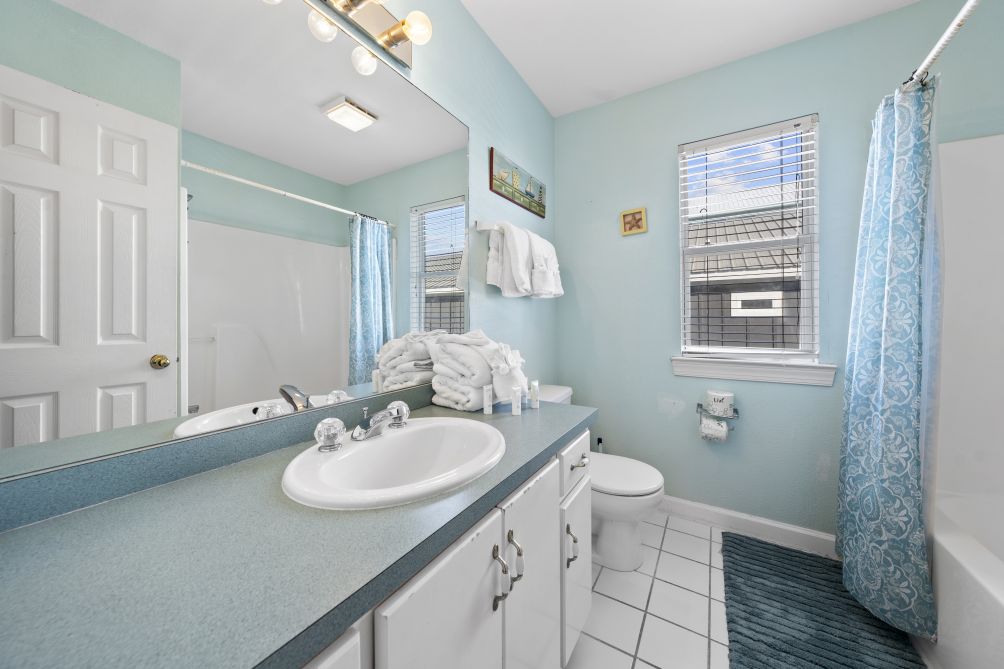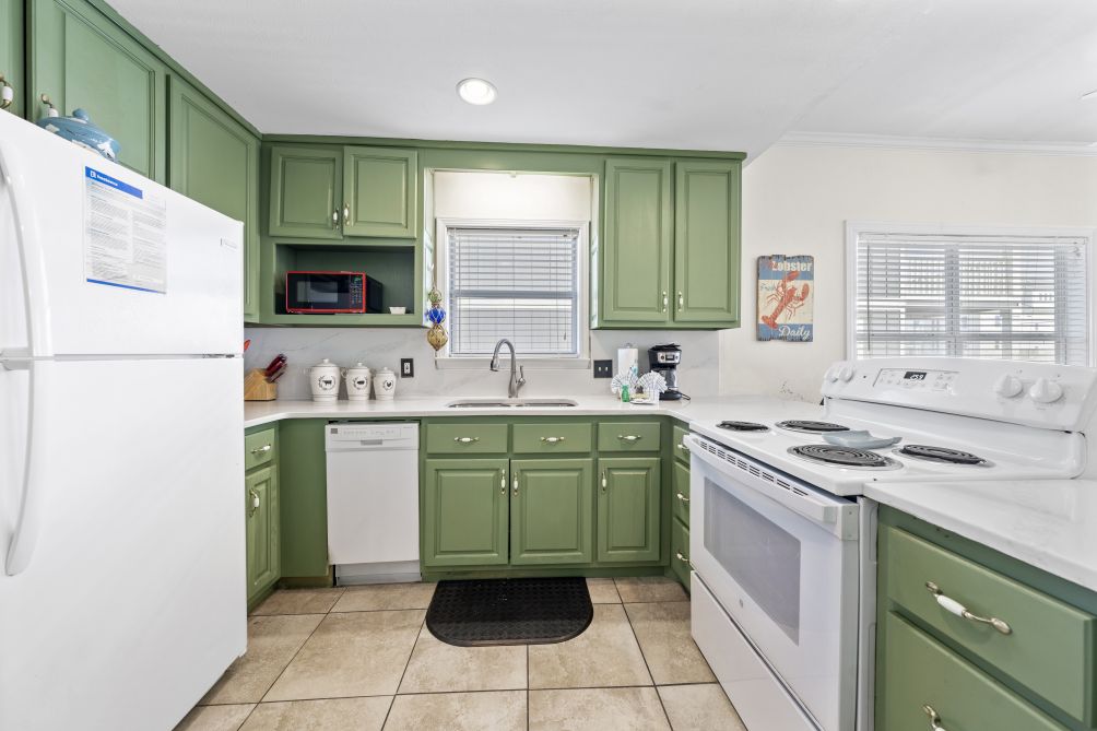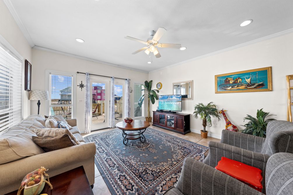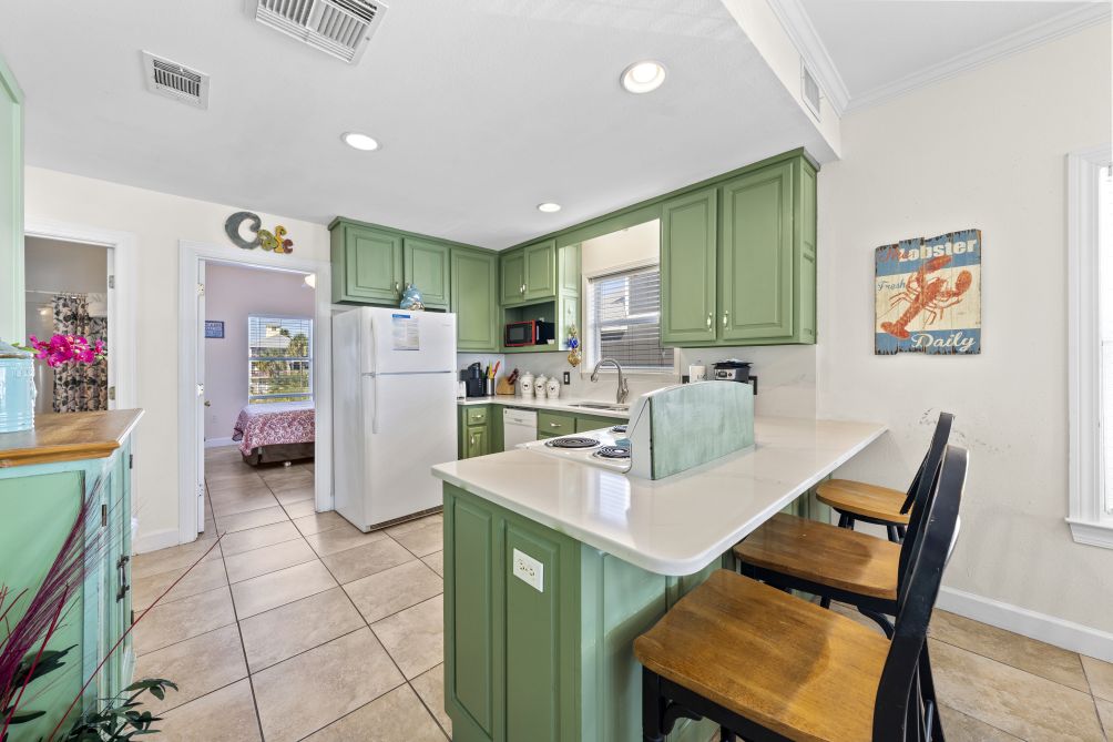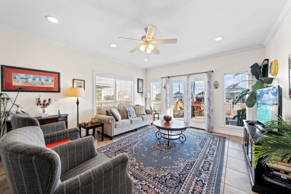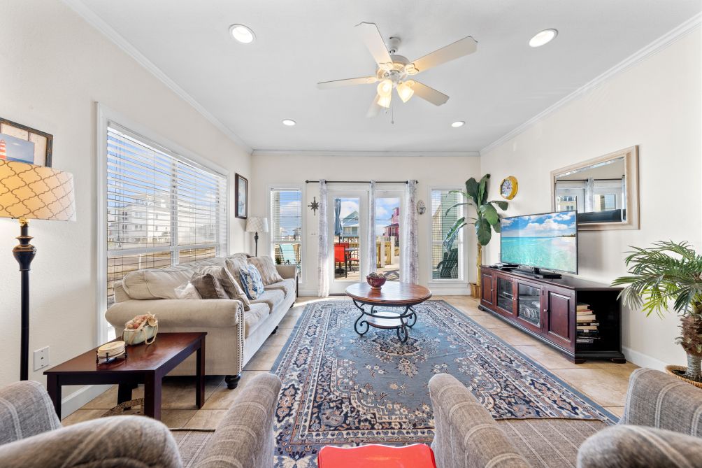 The spacious living room invites guests to gather together, featuring another flat-screen TV and a queen sleeper sofa for additional guests. The open-concept layout flows seamlessly into an equipped kitchen, stocked with all the essentials to prepare and enjoy home-cooked meals while staying connected with family and friends. Just across the street, you’ll find the beach — a pristine stretch of sand where you can relax under the sun or watch the kids splash in the waves.