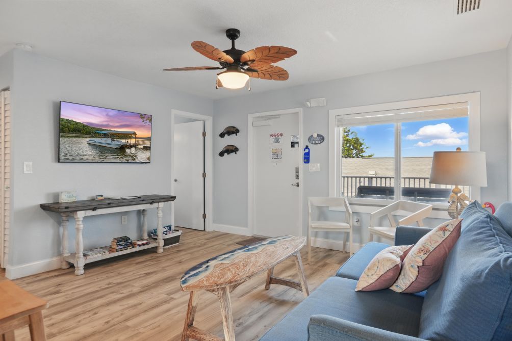 This upstairs 2 Bed/1Bath unit is perfect for a fun family get away. Complete with 1 queen bed, 1 full size, and a pull-out couch, this unit sleeps 6. With your own private balcony, complete with a partial/side ocean view, this Cottage is one of our most beloved among families and those wanting a little more space. Collect as many seashells as your pockets can hold! Create memories that won't wash away with your footprints and relax in the salty breezes!