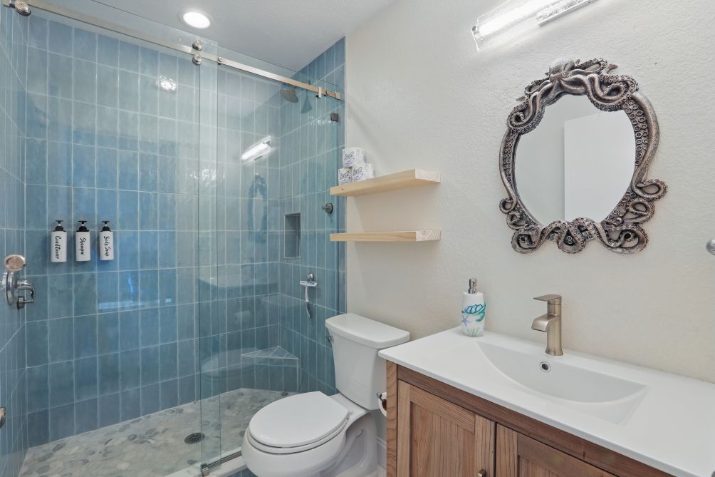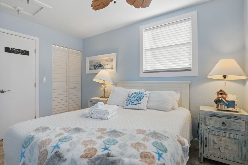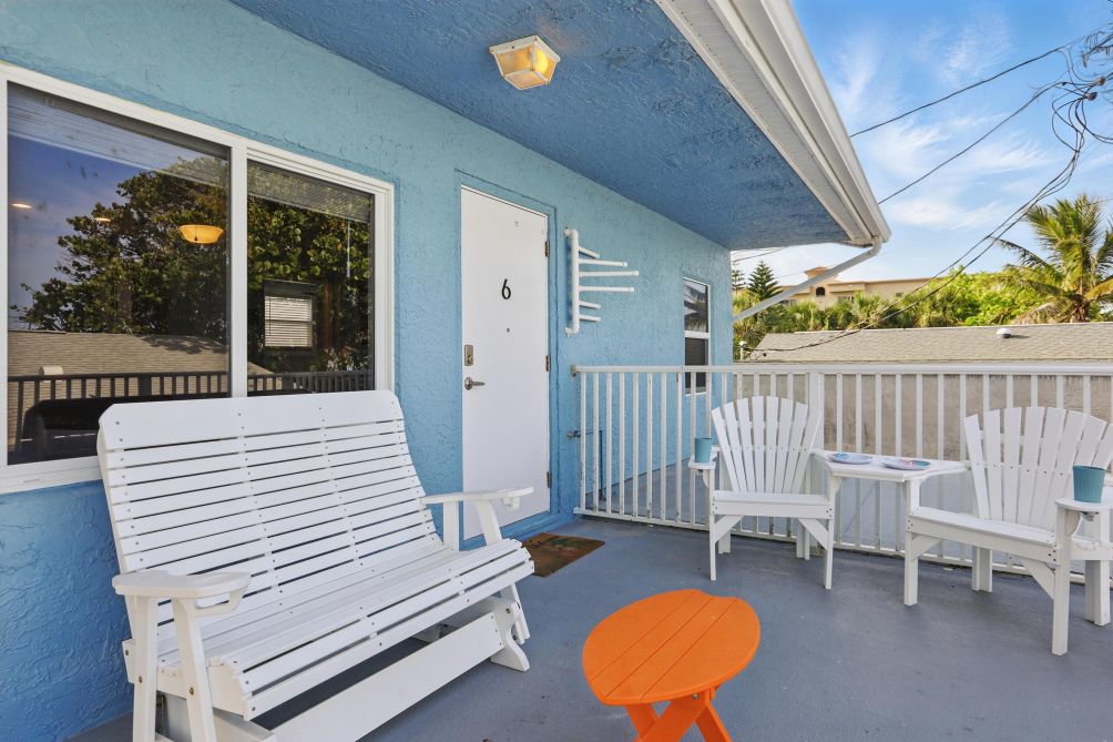 A freshly remodeled, 2nd floor Executive Cottage with private entrance and side view of the Atlantic Ocean from your front door. Go up the stairs and you’ll find a beautiful balcony to enjoy your coffee or cocktails on while you relax in the Florida sun. This unit has all the essentials and more for a private stay on the beach with friends and family. New floors, new windows, new kitchen countertops and appliances, new paint, new walk-in shower and bathroom vanity, all new linens and towels.