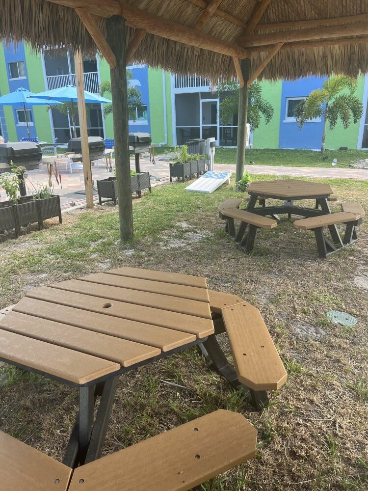 • The exterior or the pool complex is gated which includes the pool, hot tub, grills, chiki hut, and lounging area for guests.