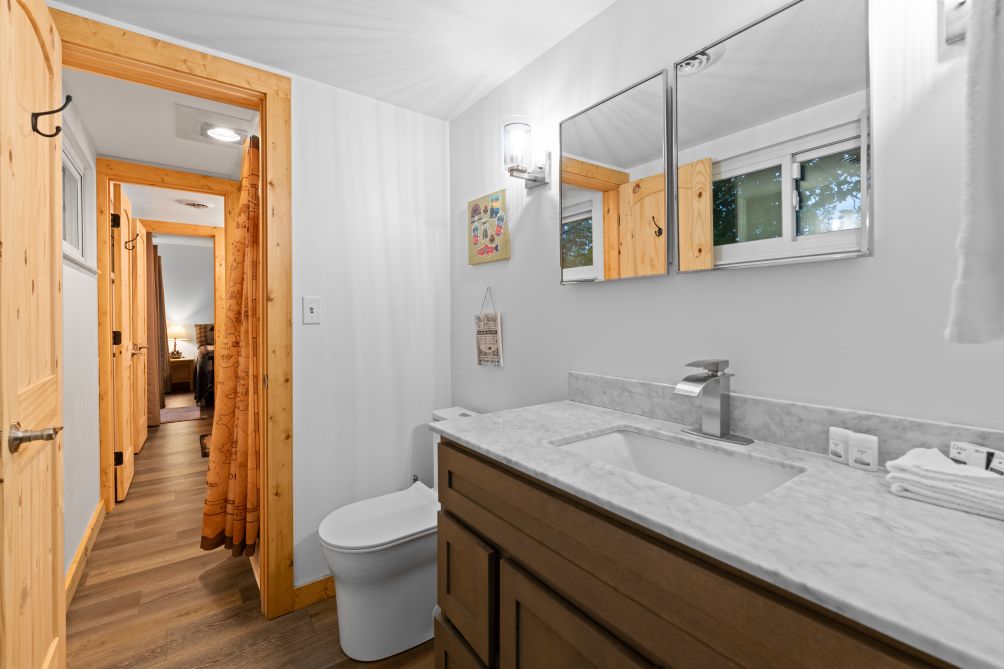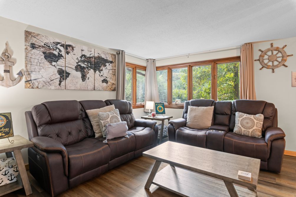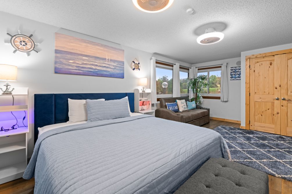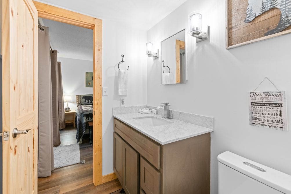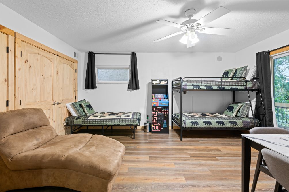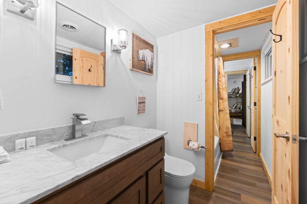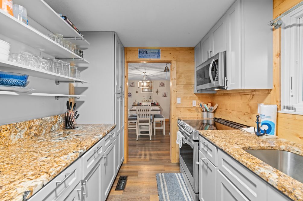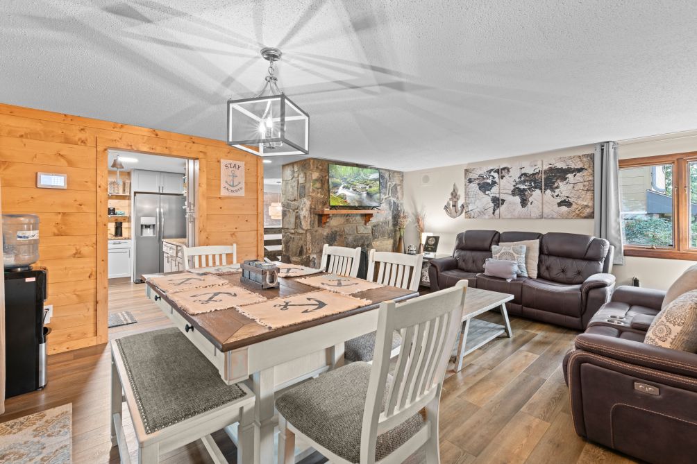 Inside, this home has been fully renovated from top to bottom, offering everything needed for a relaxing and memorable stay. The living room welcomes group downtime with a new gas fireplace, cozy seating, and a smart TV—perfect for movie nights. The updated kitchen features new granite countertops, cabinets, appliances, and space for preparing family-style meals, which you can enjoy at the dining table for eight.