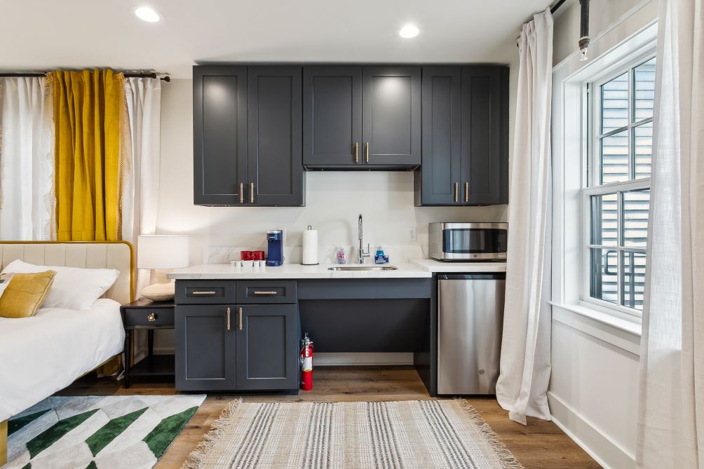 • Kitchenette with microwave, mini-fridge, sink, and Keurig coffee maker (with pods)