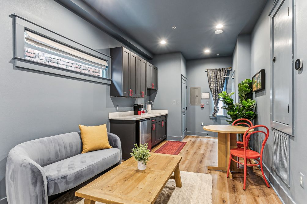 • Kitchenette with microwave, mini-fridge, sink, and Keurig coffee maker (with pods)