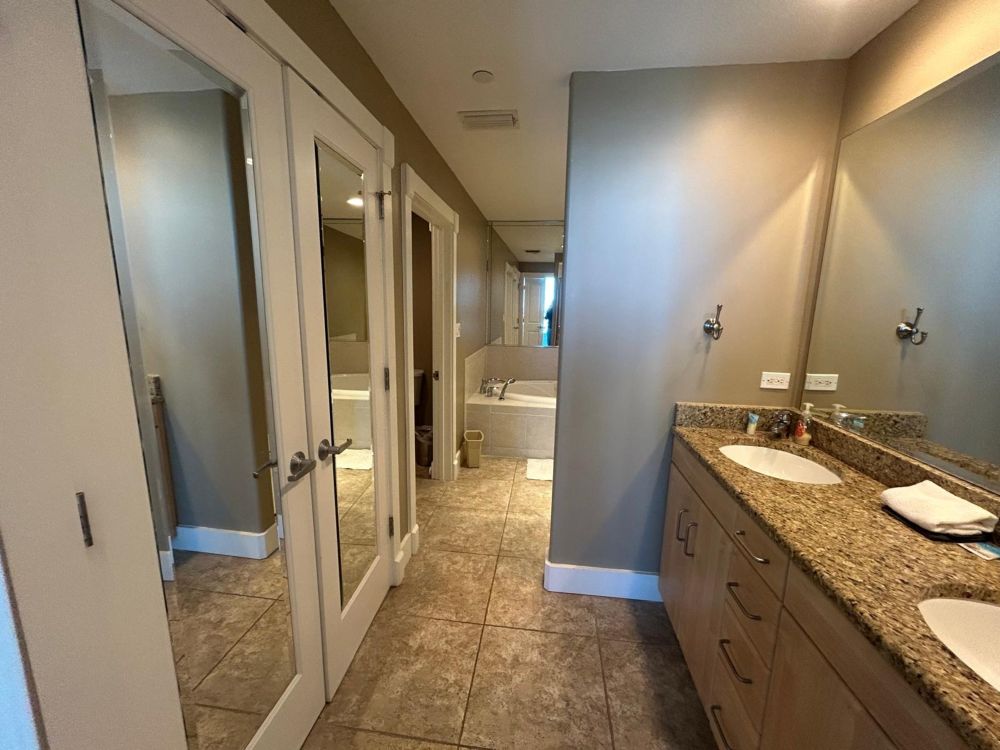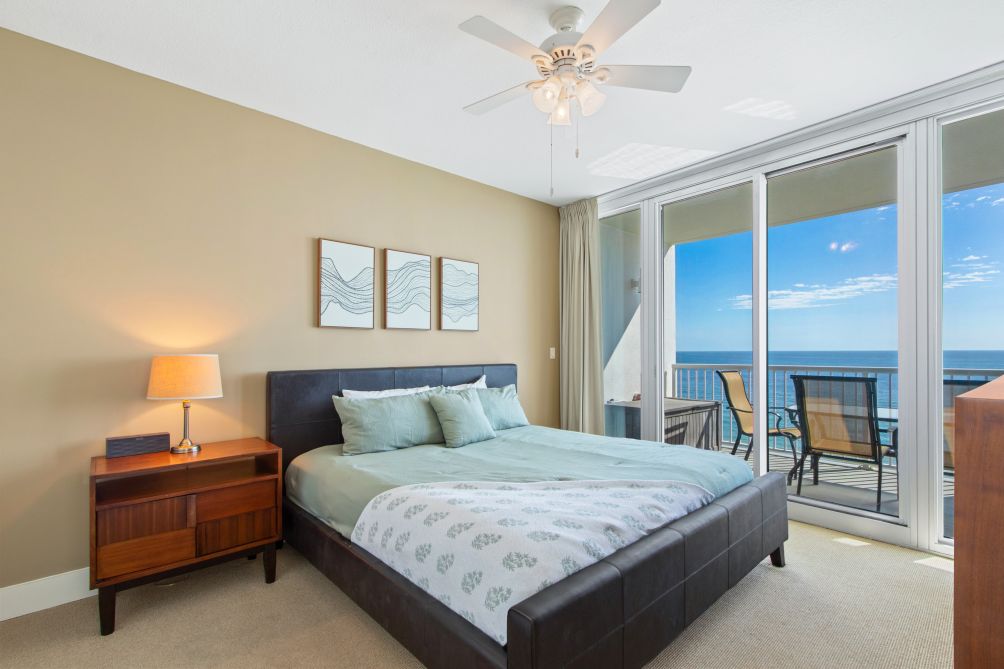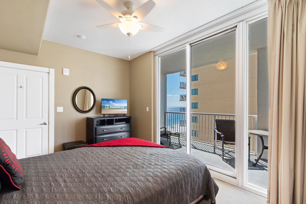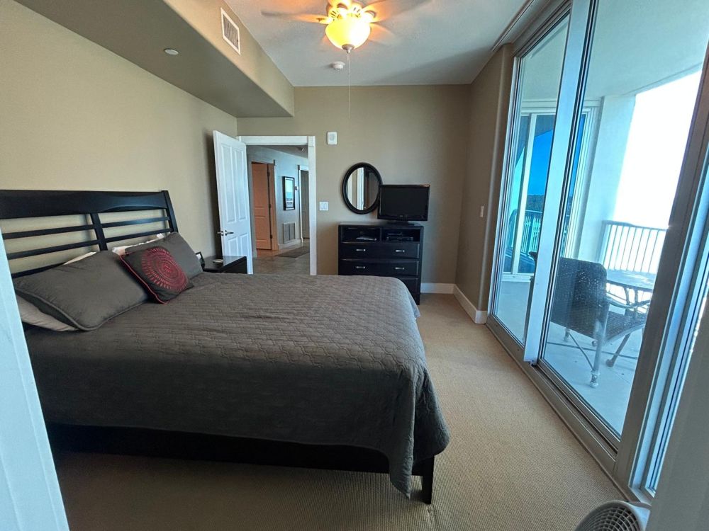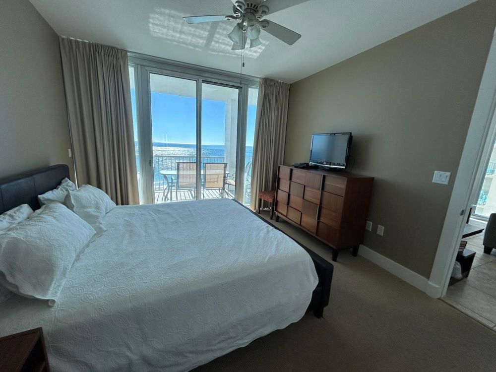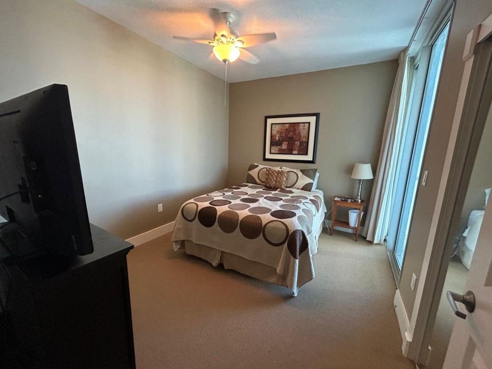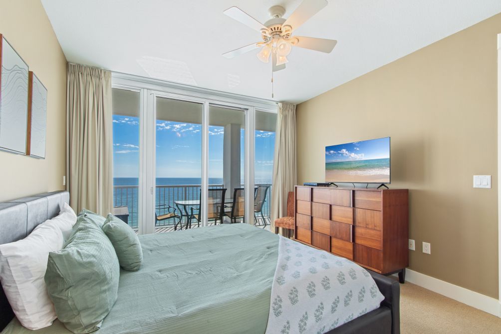 The Primary bedroom offers a peaceful getaway with its king bed, private bathroom featuring a Jacuzzi tub and separate walk-in shower, and direct access to the balcony so you can step out and enjoy the breeze anytime. A second bedroom features a queen bed, while the third bedroom also includes a queen bed, and balcony access—giving everyone plenty of comfort and privacy. TVs are available in each bedroom, and the condo can host up to 8 guests.