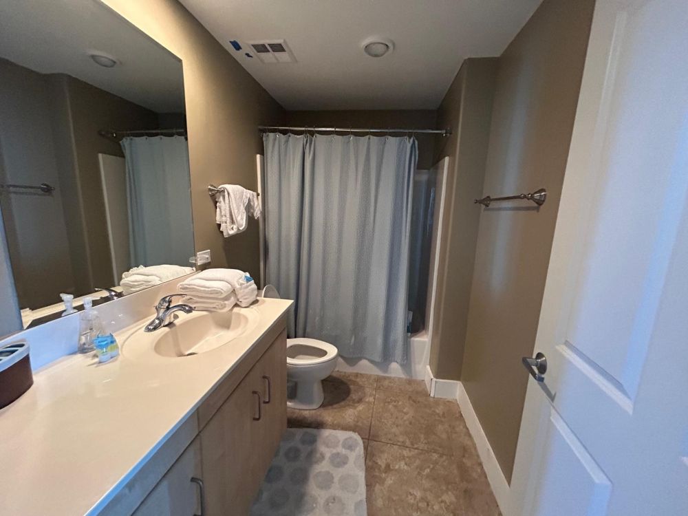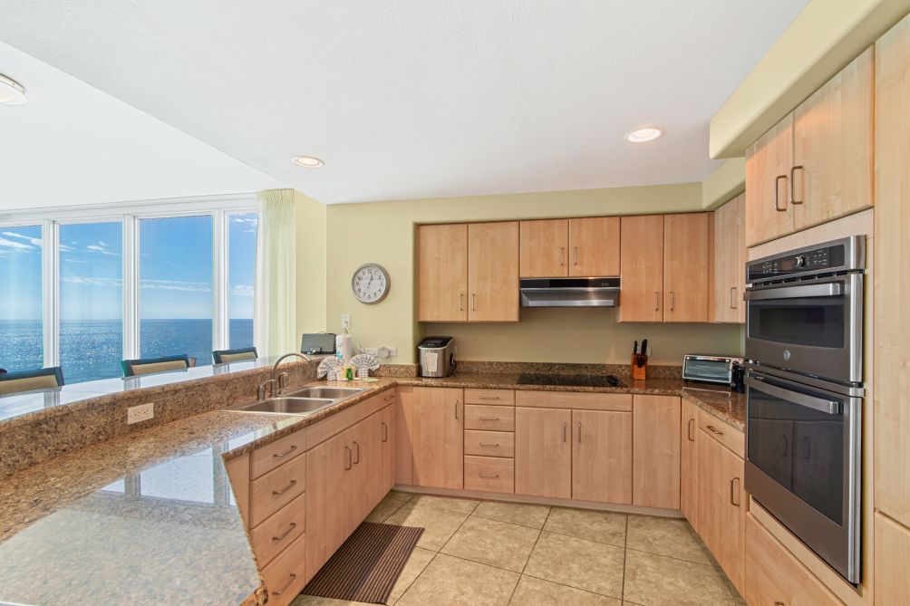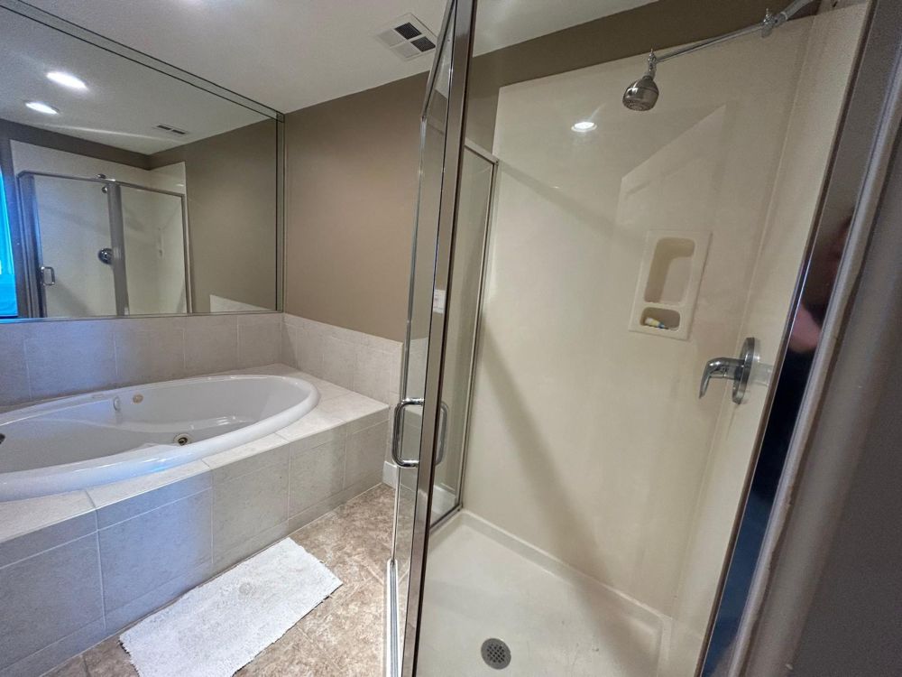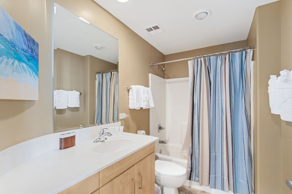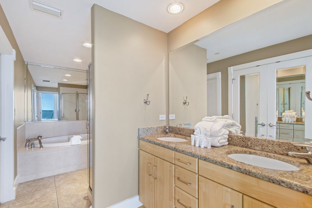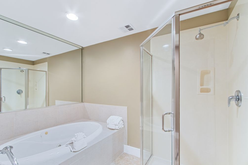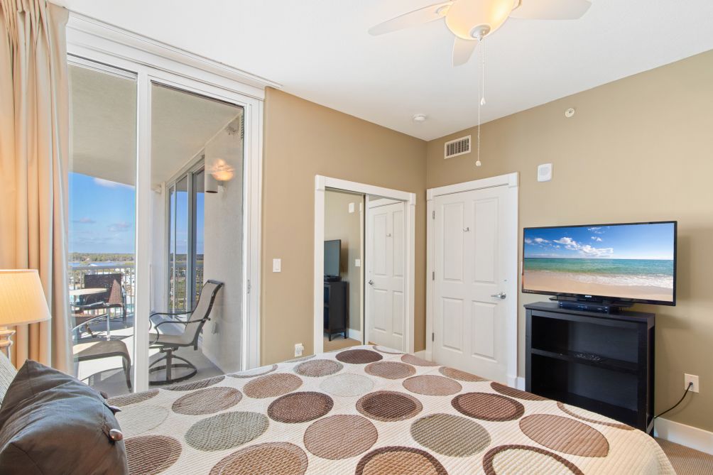 The Primary bedroom offers a peaceful getaway with its king bed, private bathroom featuring a Jacuzzi tub and separate walk-in shower, and direct access to the balcony so you can step out and enjoy the breeze anytime. A second bedroom features a queen bed, while the third bedroom also includes a queen bed, and balcony access—giving everyone plenty of comfort and privacy. TVs are available in each bedroom, and the condo can host up to 8 guests.