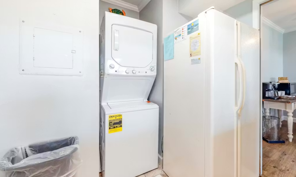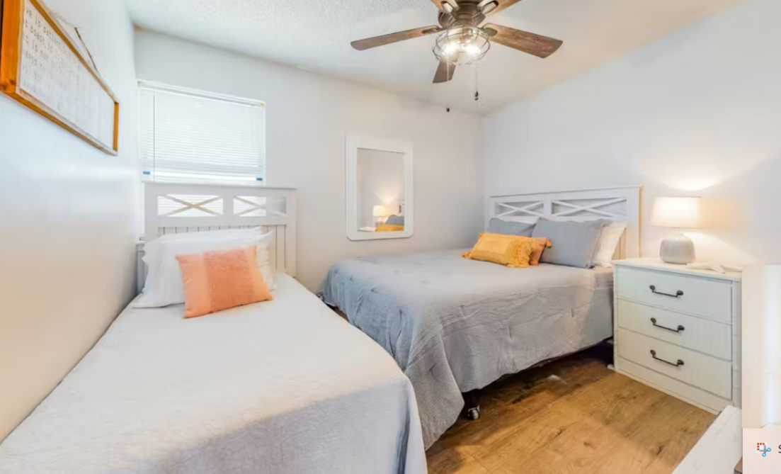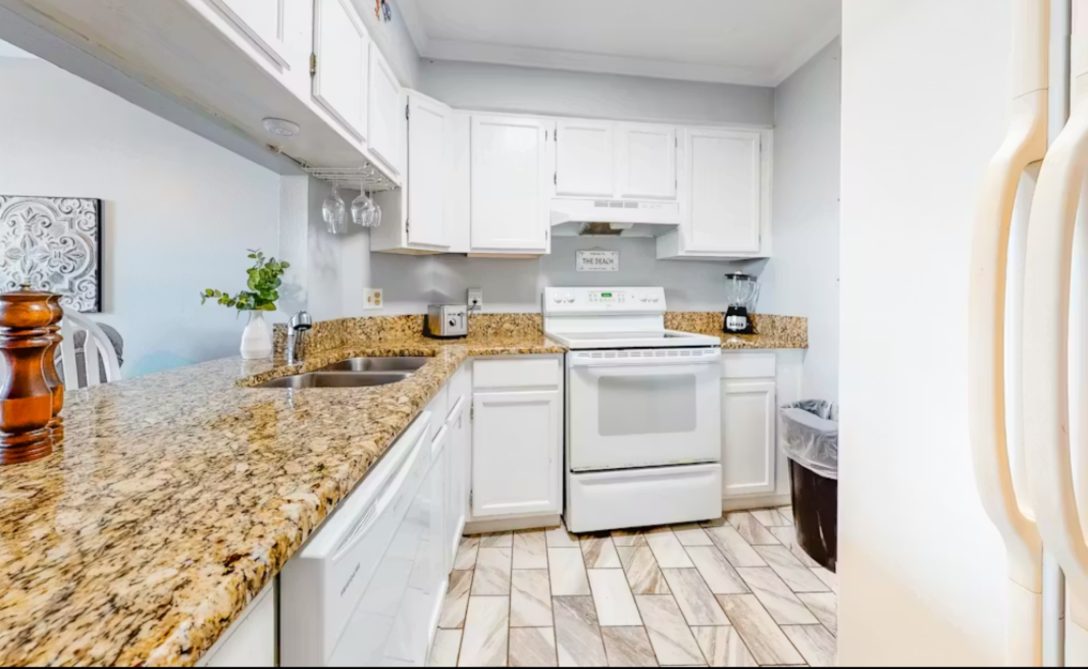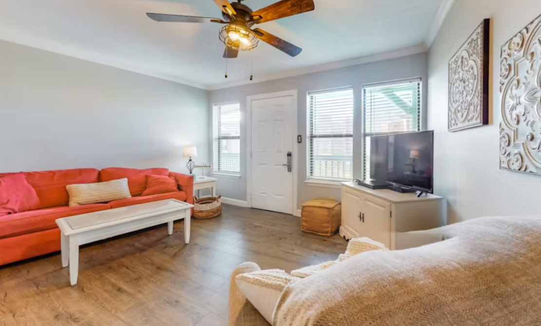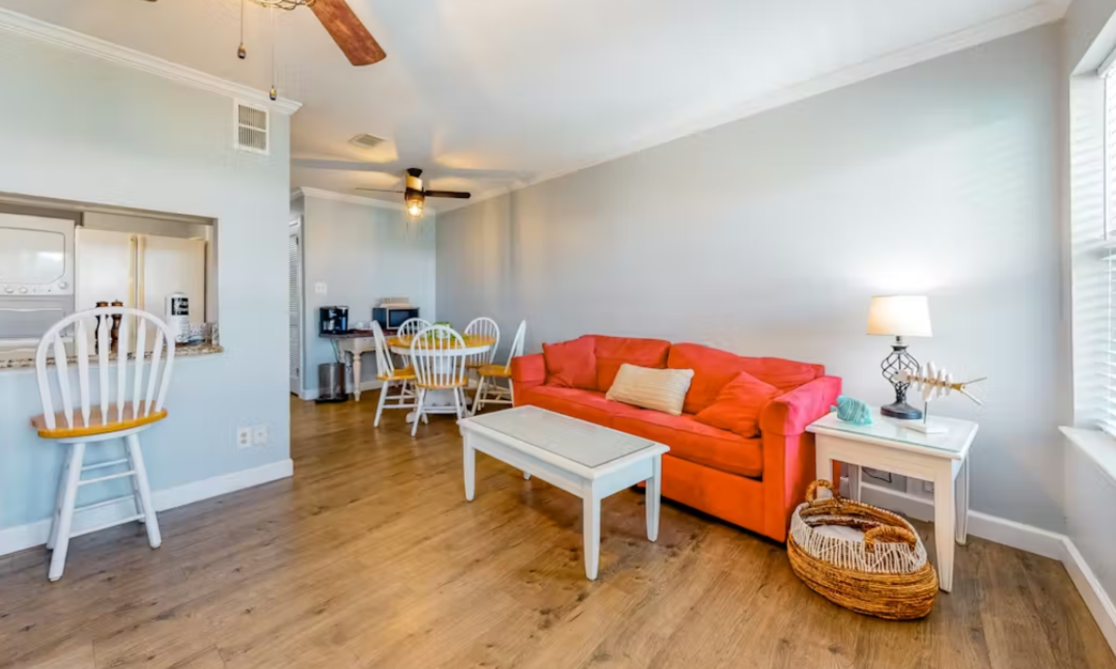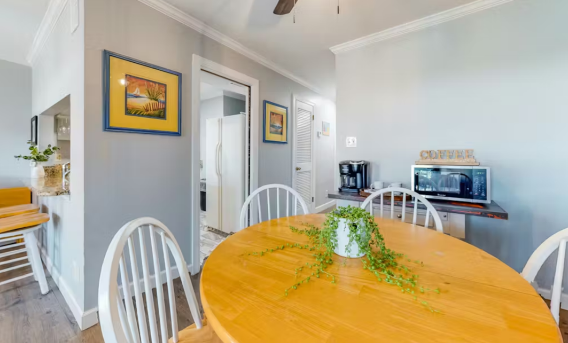 Step inside and you’ll be greeted by a bright, welcoming interior filled with natural light. The cozy living area offers a comfortable place to unwind, whether you're settling in for a movie night or catching up on your favorite shows. The fully equipped kitchen makes it simple to whip up anything from quick beach snacks to full family meals, and the breakfast bar adds the perfect spot for casual dining.