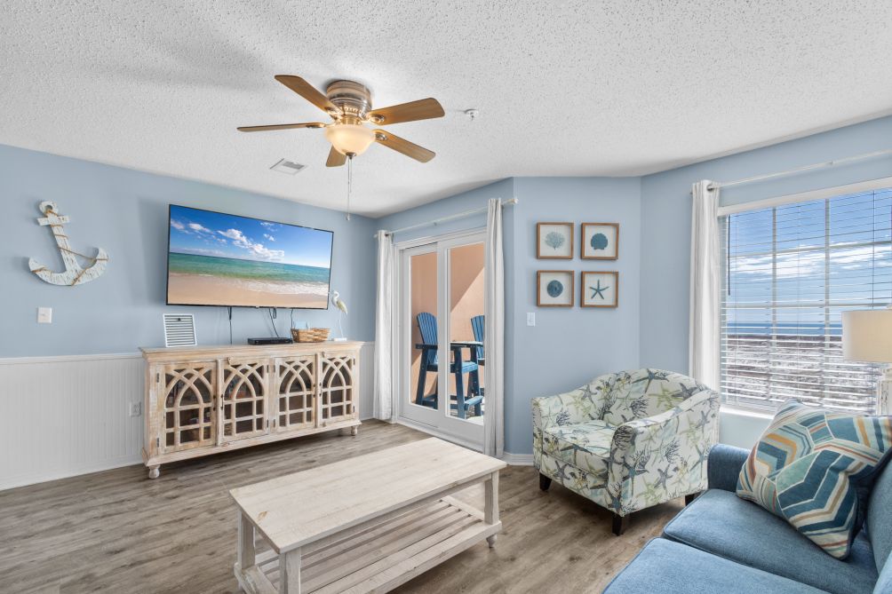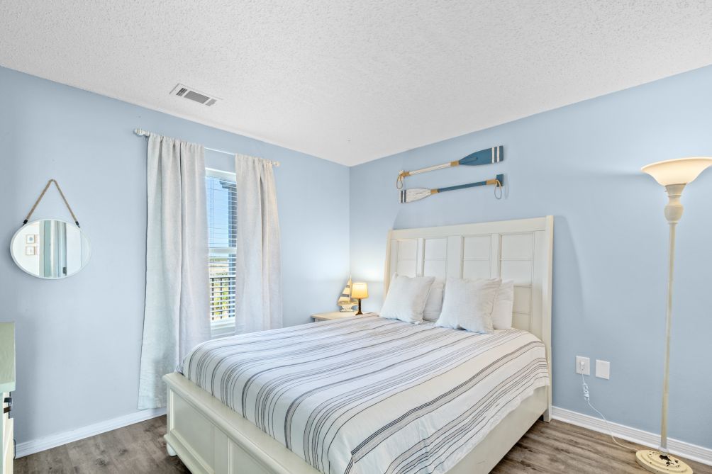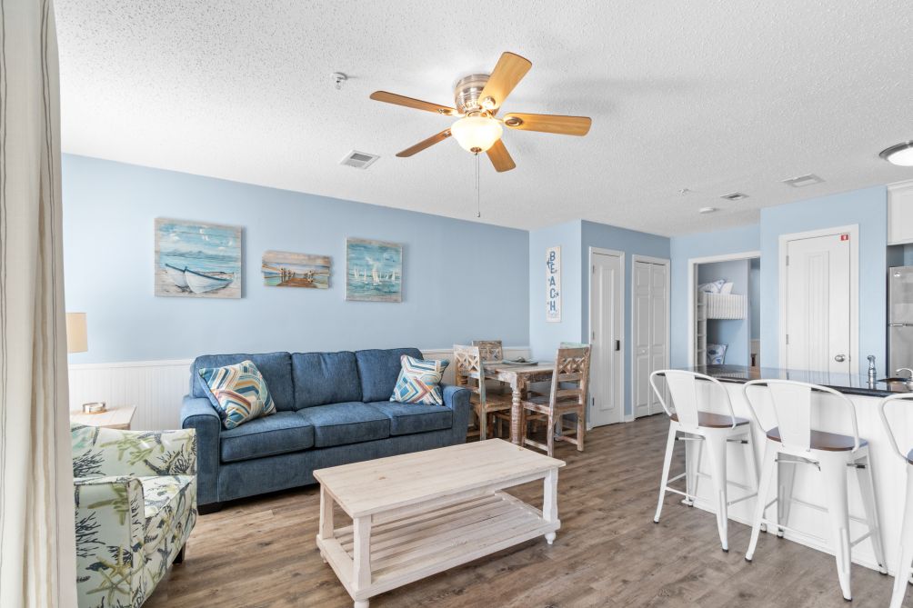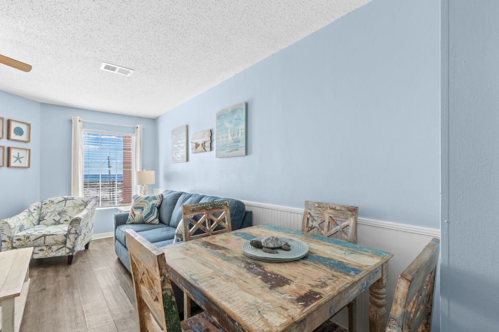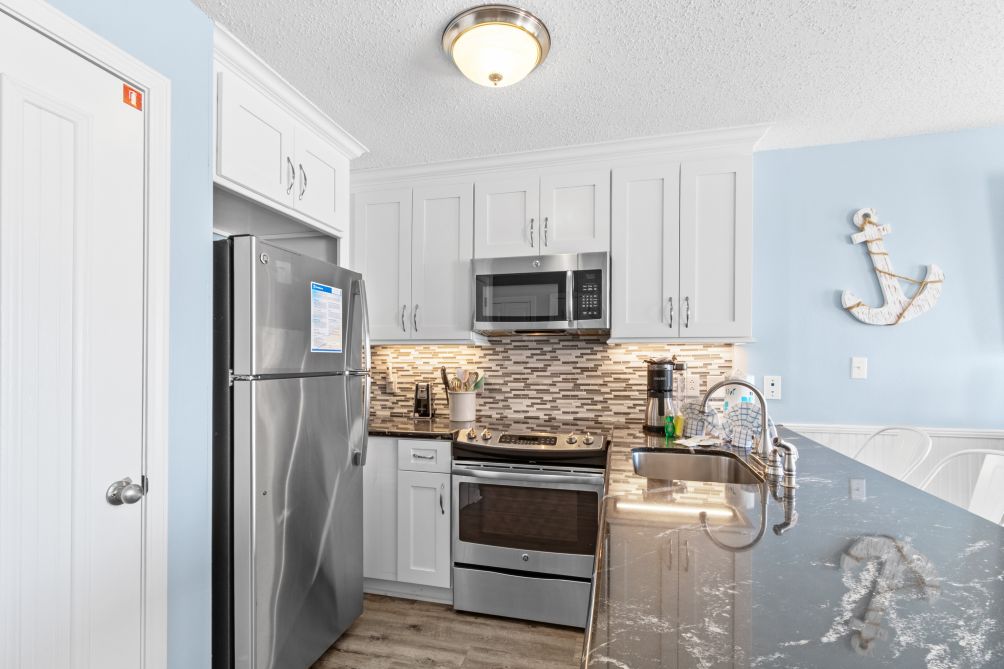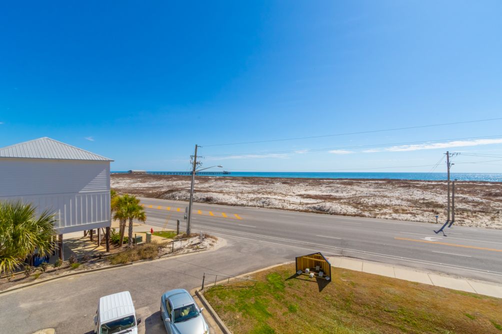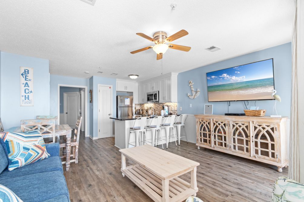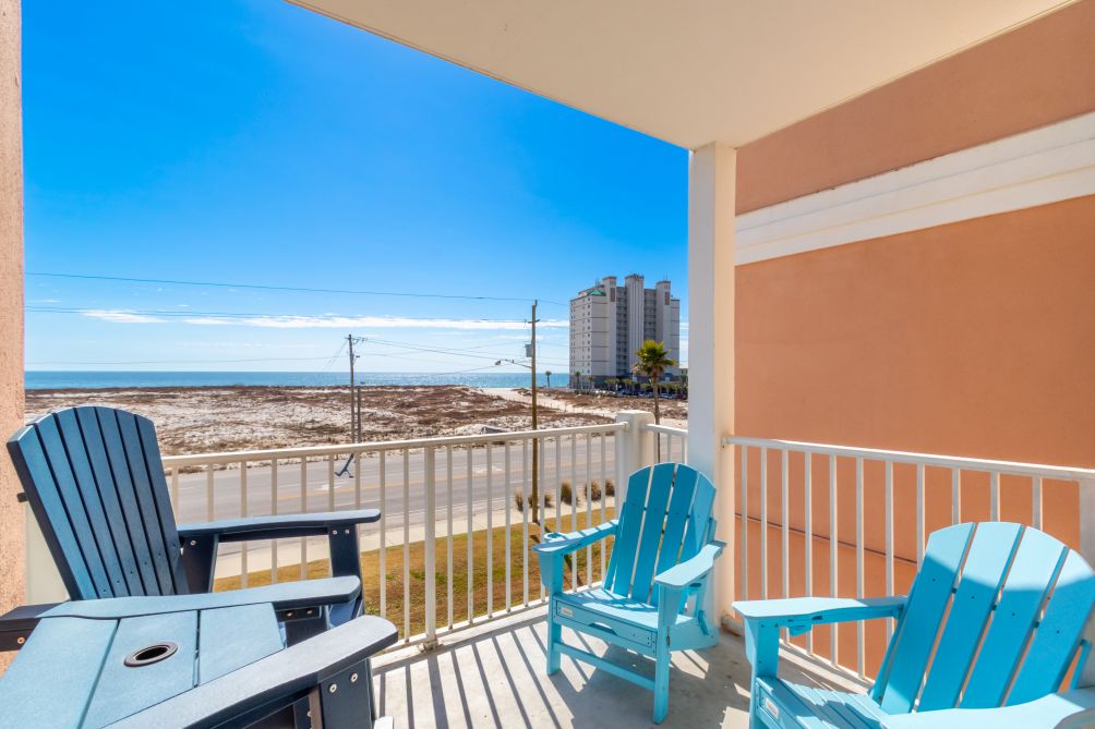 Enjoy a relaxing stay in this beautifully remodeled one-bedroom retreat, thoughtfully designed for couples or small families. The primary bedroom features a comfortable king-size bed, while the built-in twin bunk beds in the hallway provide additional sleeping space. Located directly across Beach Boulevard from the pristine Gulf State Park Beach, this condo offers a peaceful coastal experience with nearly ¾ mile of uncrowded shoreline and no nearby buildings or parking access—making it easy to relax, spread out, and truly enjoy the beach. Inside, the condo is finished with luxury vinyl plank flooring throughout and offers a bright, welcoming living space. Unwind in the living room with a 55" Smart TV, while the bedroom includes a 43" Smart TV for added comfort and privacy. The fully equipped kitchen features granite countertops, a dining table, and four bar stools, making it perfect for meals at home. A washer and dryer are conveniently located in the unit for longer stays. Step out onto your private balcony to take in beautiful, unobstructed views of Gulf State Park Beach and the pier. Beach access is just across Beach Boulevard via a nearby access path, and because this condo sits at the east end of the development, the beach is typically far less crowded than other nearby areas.