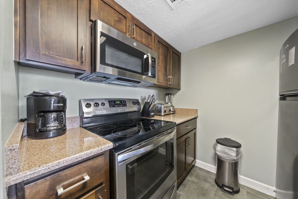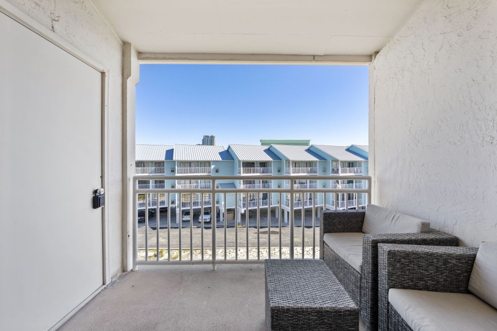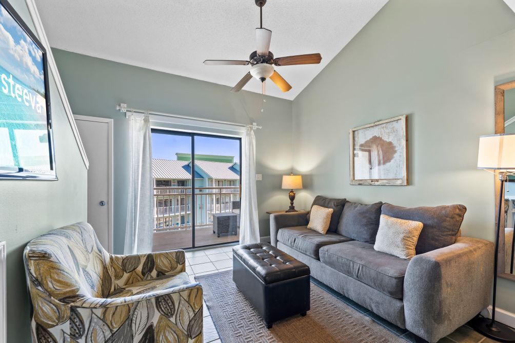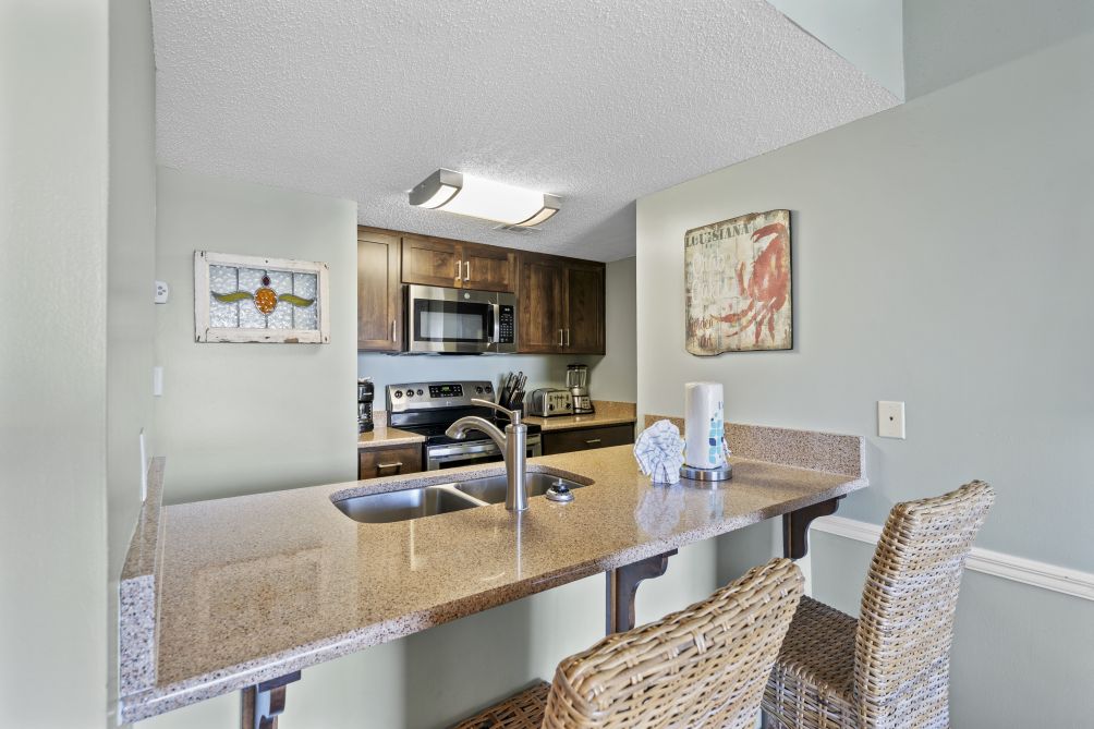 The condo features a comfortable and inviting living area with a flat-screen TV, a cozy sitting space. The equipped kitchen includes stainless steel appliances and granite countertops, blending style with functionality. Step out onto the private balcony to relax and take in side views of the beach and the Gulf, adding the perfect outdoor extension to the living space. The layout includes two full bathrooms and tasteful décor throughout, with quality finishes that enhance the overall comfort of the condo.