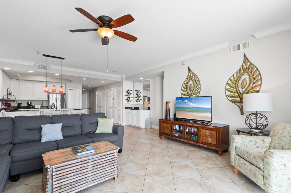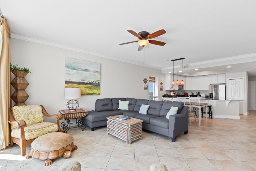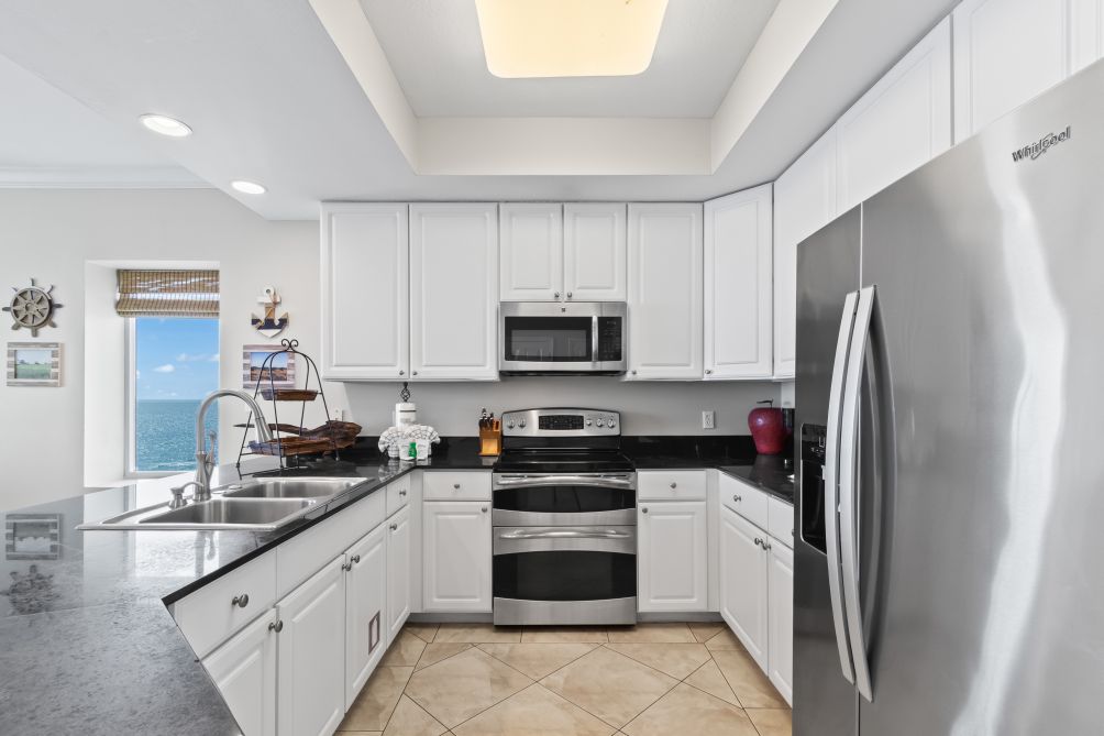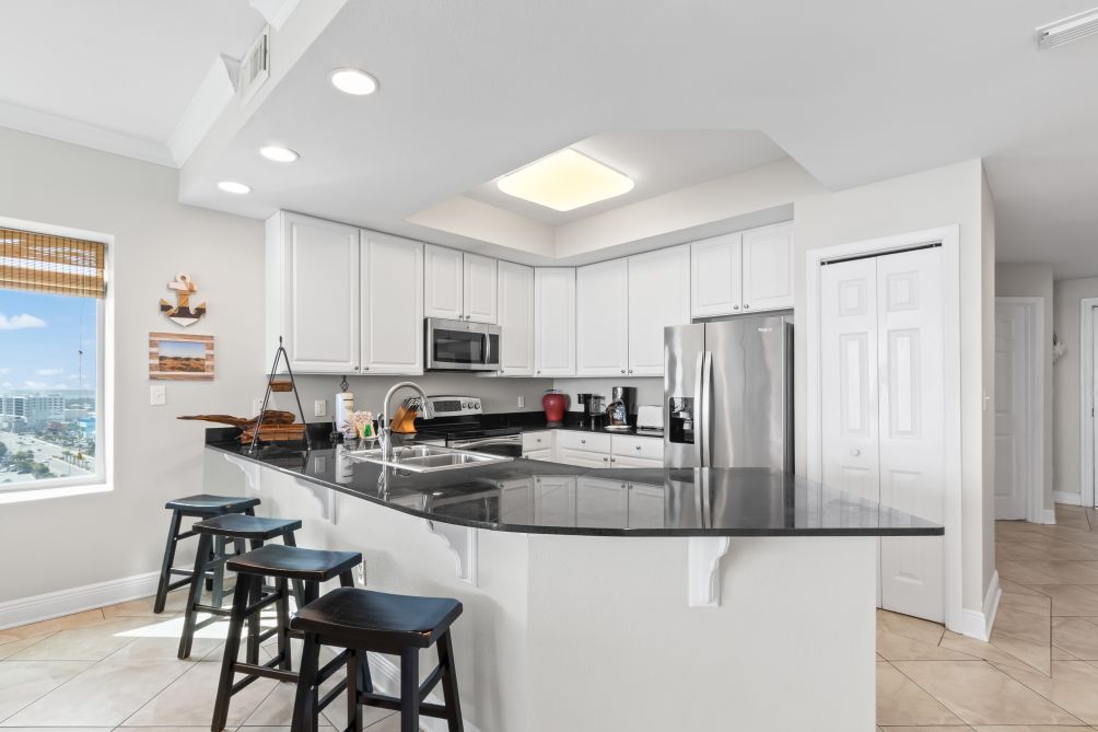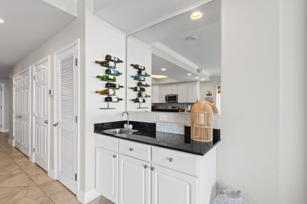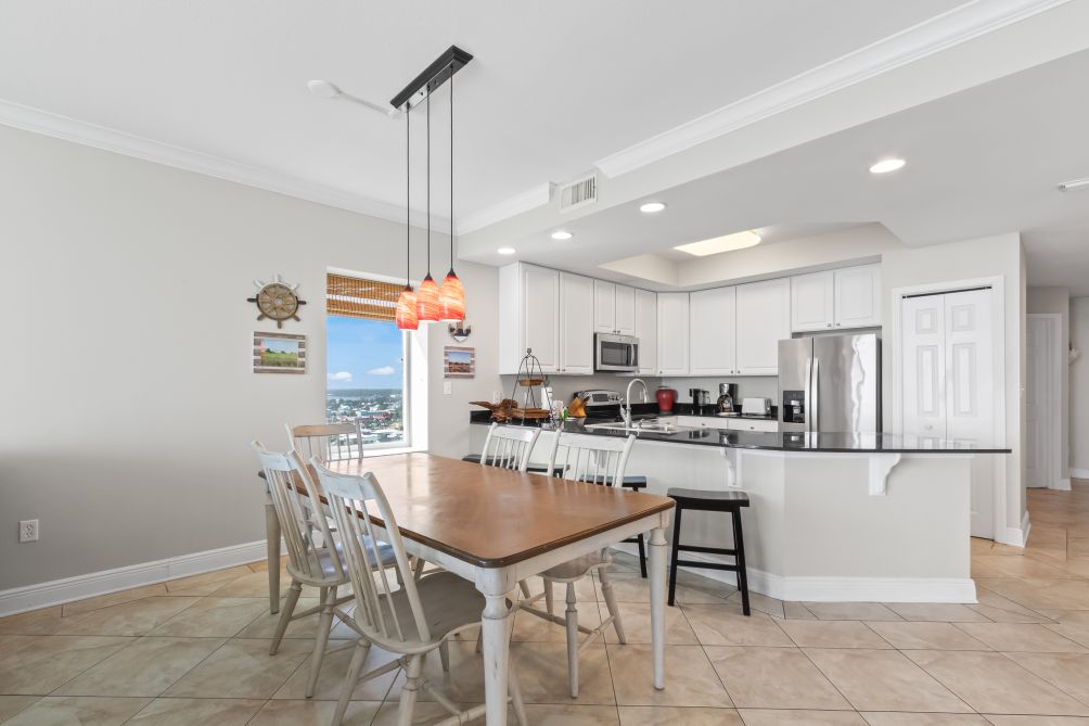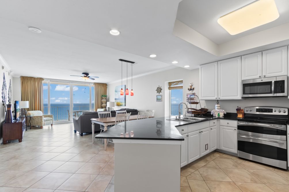 The open-concept living area is designed for relaxation and entertaining, featuring ample seating and a fully equipped kitchen with granite countertops. Enjoy the convenience of a wet bar with an ice maker and a generous dining area, perfect for hosting. Step outside onto your private oversized Gulf-front deck, an ideal spot for sipping morning coffee while watching the sunrise or enjoying a sunset cocktail with endless western shoreline views.