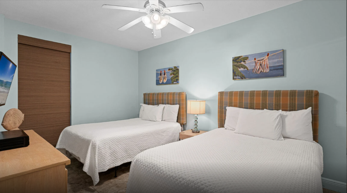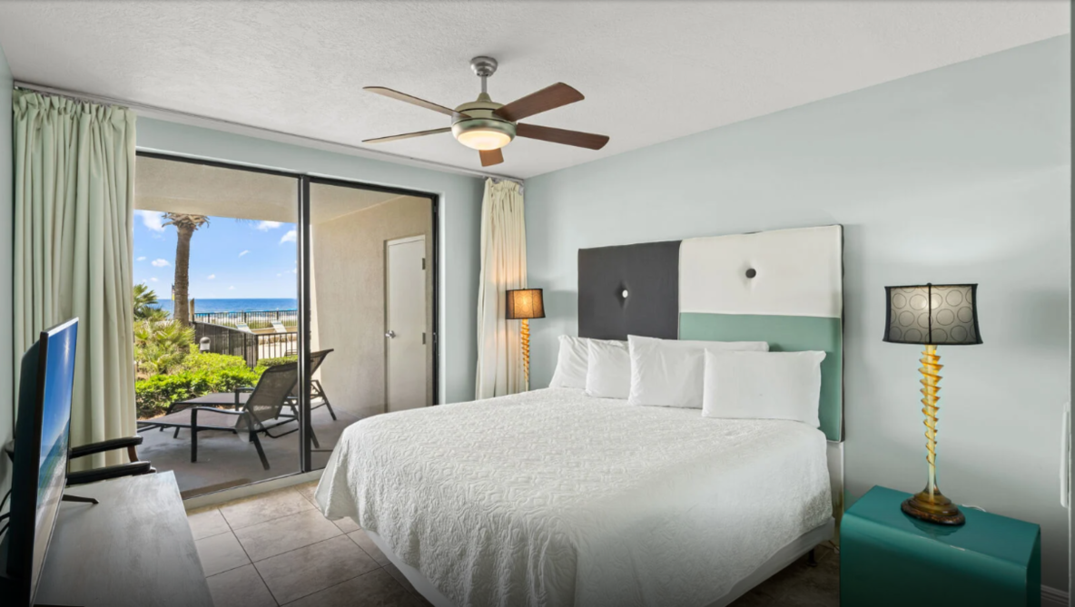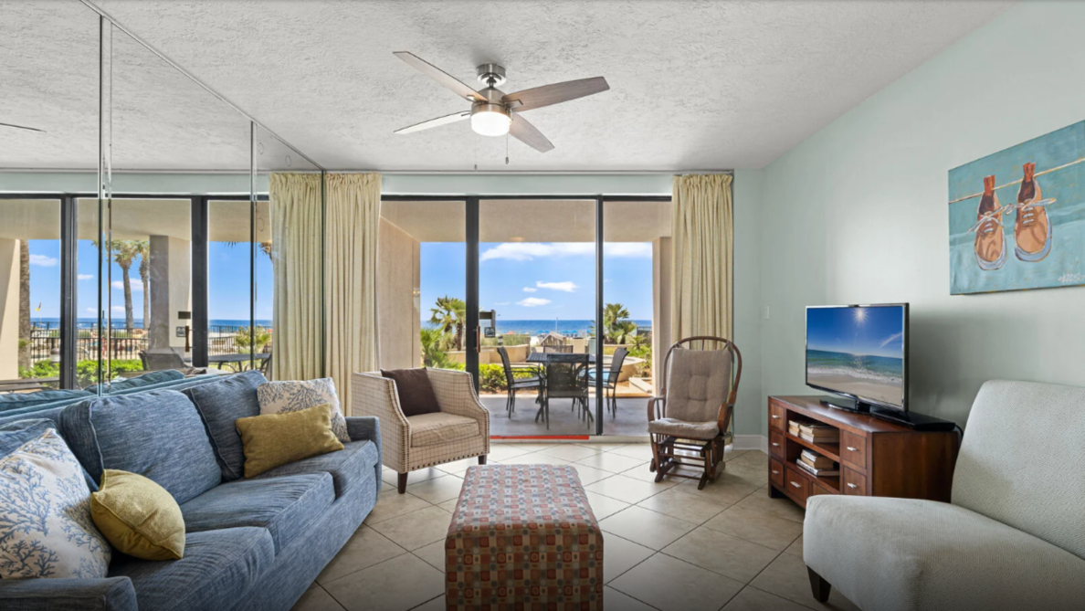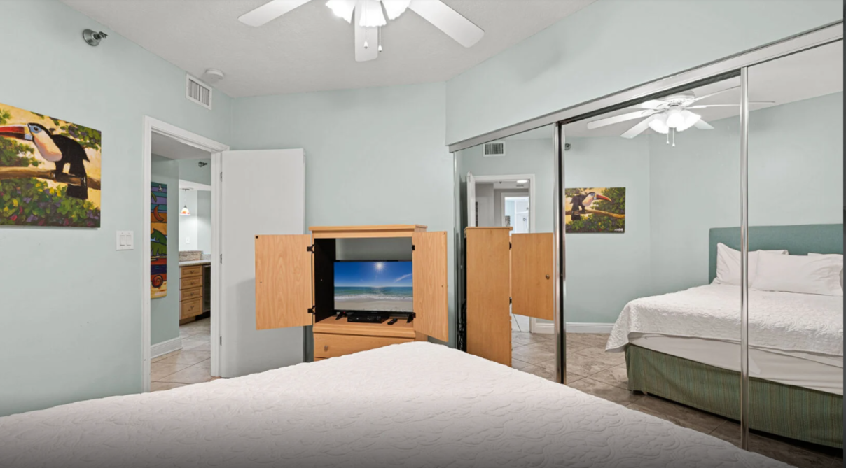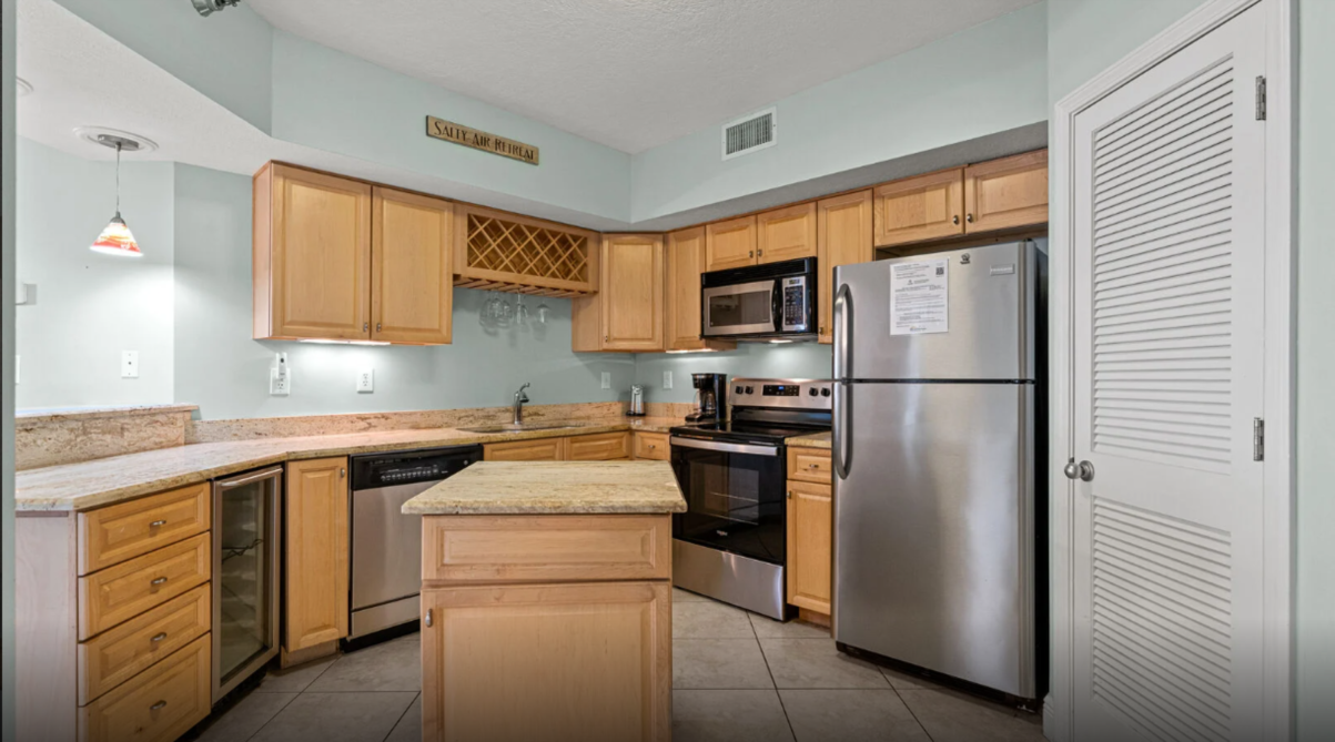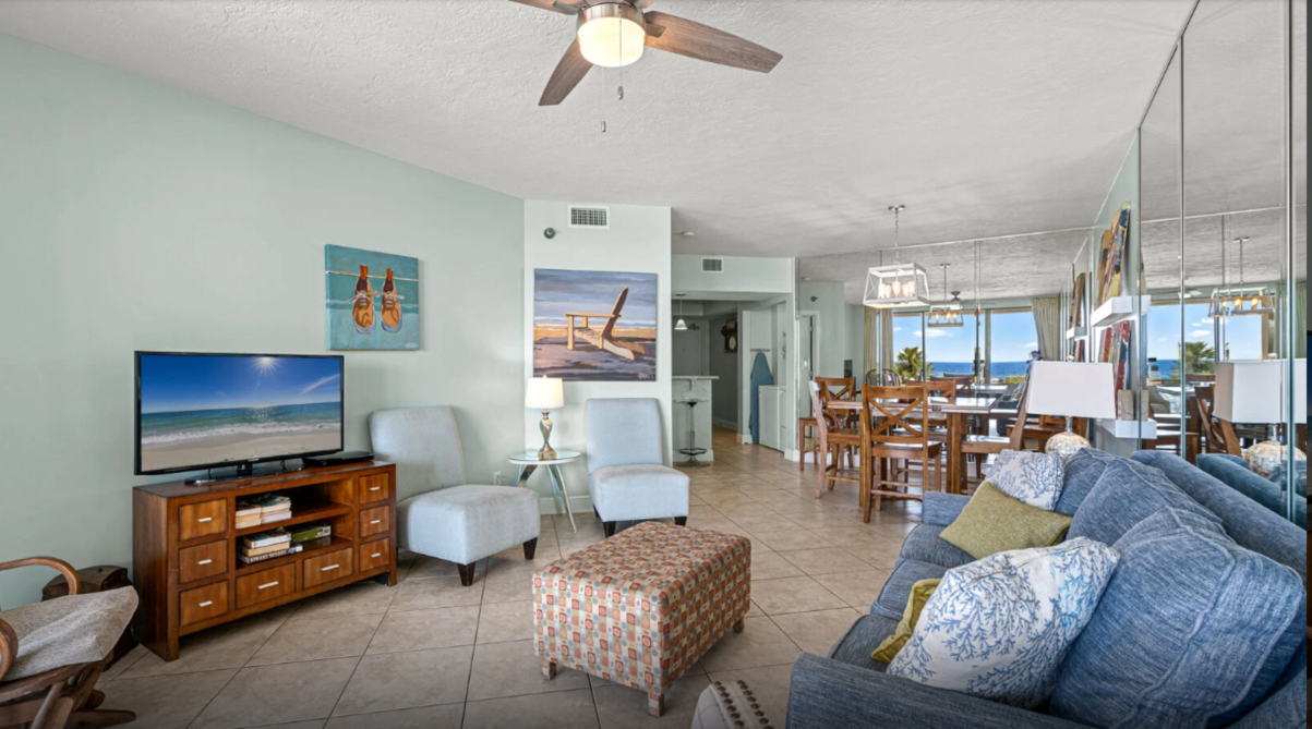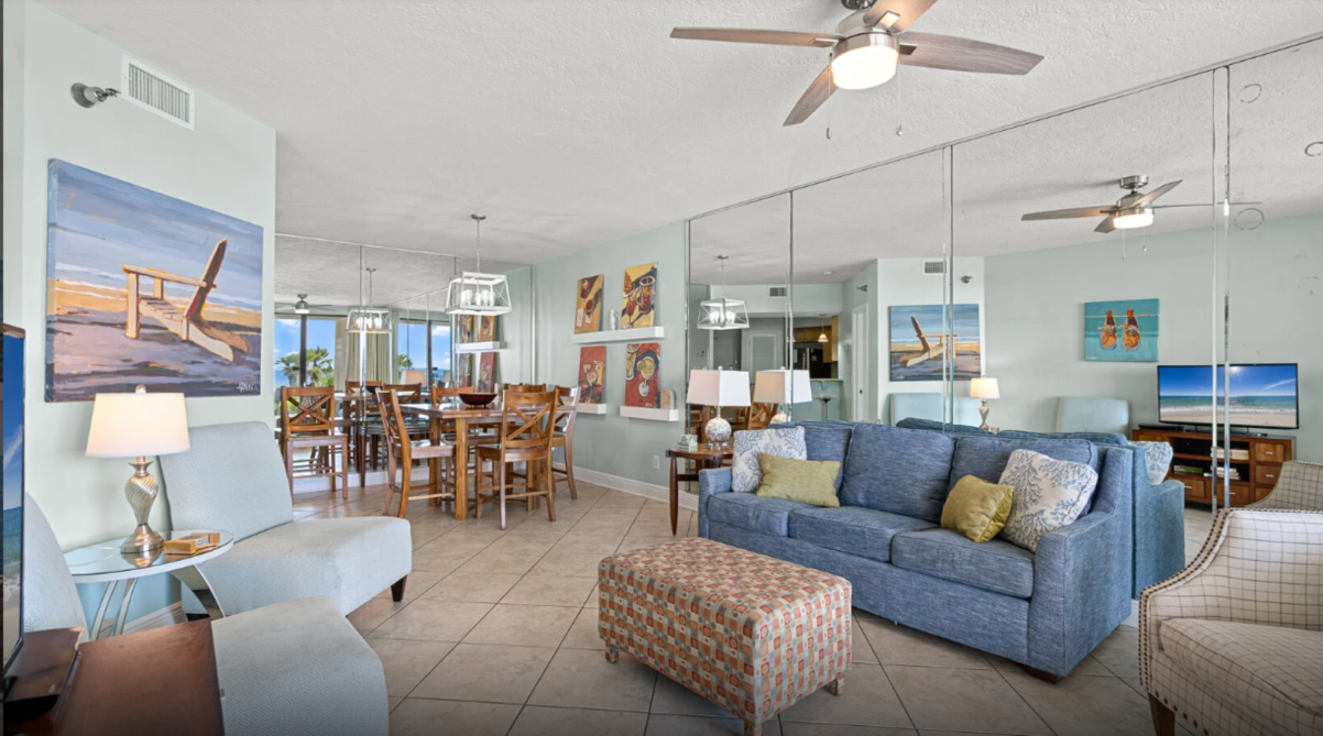This inviting three-bedroom condo in Orange Beach offers an ideal setting for a laid-back family escape. The open living area feels bright and welcoming, featuring comfortable seating, a large television, and plenty of natural light. A fully equipped kitchen with modern appliances makes meal prep effortless - whether you’re planning a hearty breakfast or quick bites after a day by the shore.
