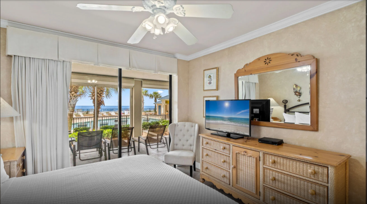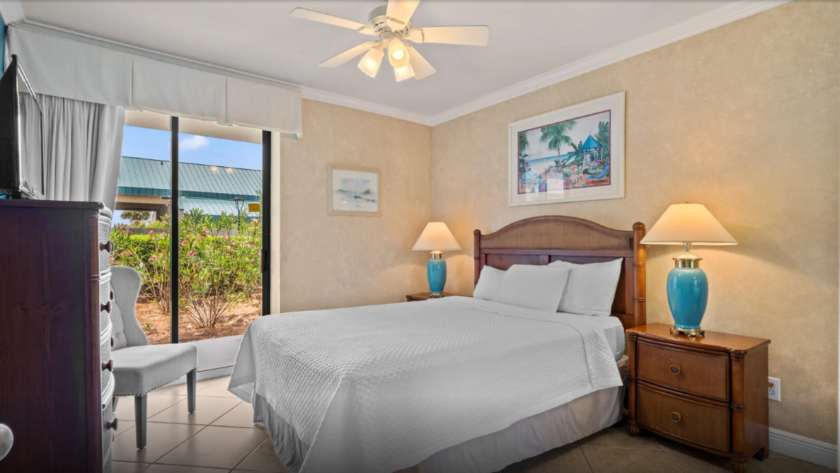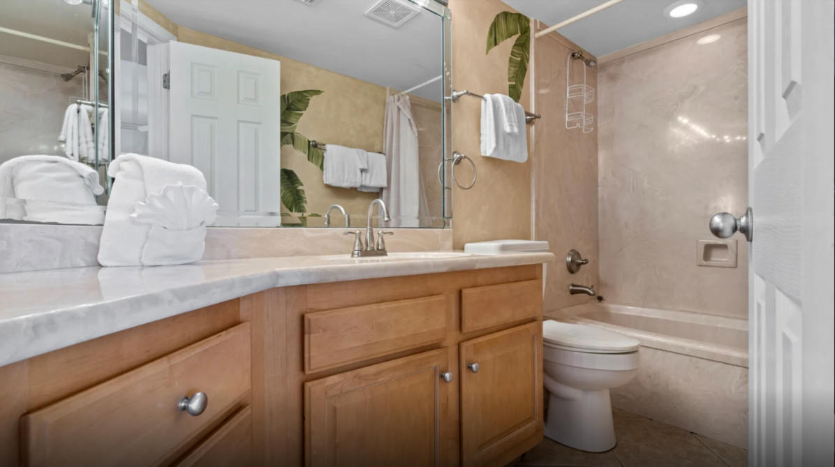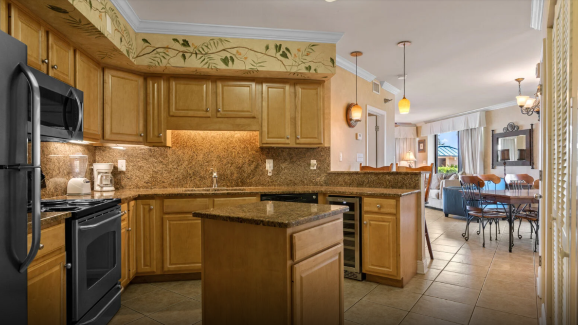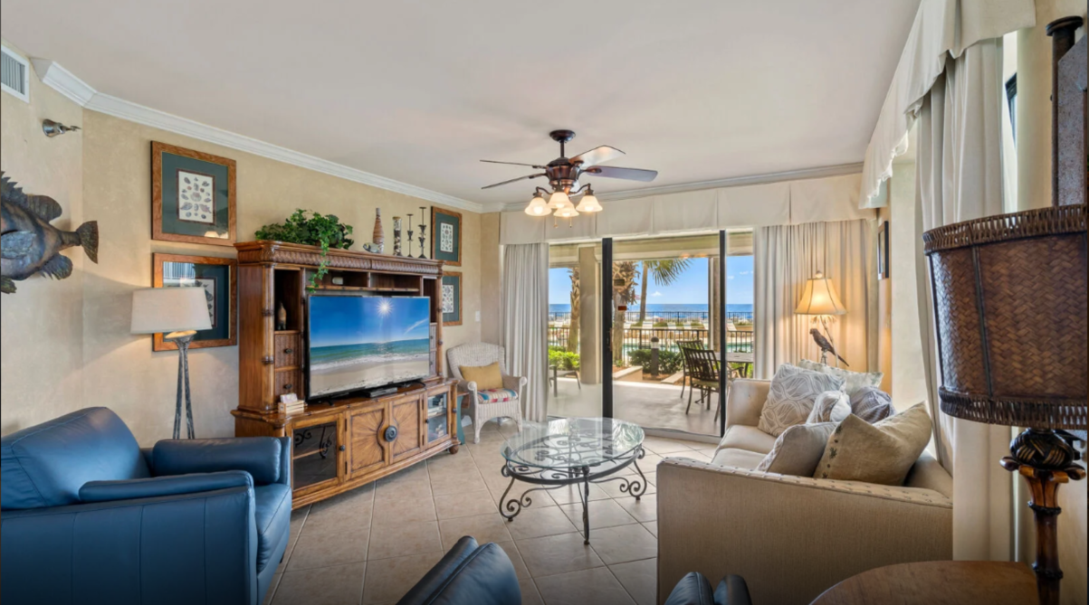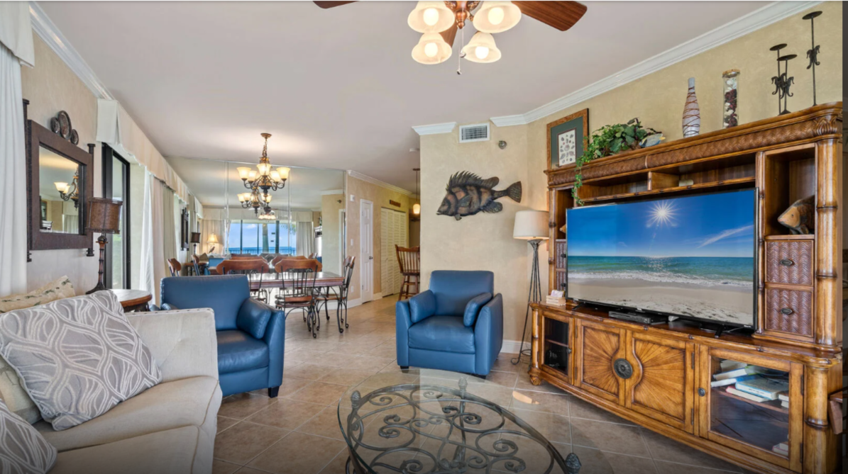 This inviting three-bedroom condo in Orange Beach offers an ideal setting for a laid-back family escape. The open living area feels bright and welcoming, featuring comfortable seating, a large television, and plenty of natural light. A fully equipped kitchen with modern appliances makes meal prep effortless—whether you’re planning a hearty breakfast or quick bites after a day by the shore.