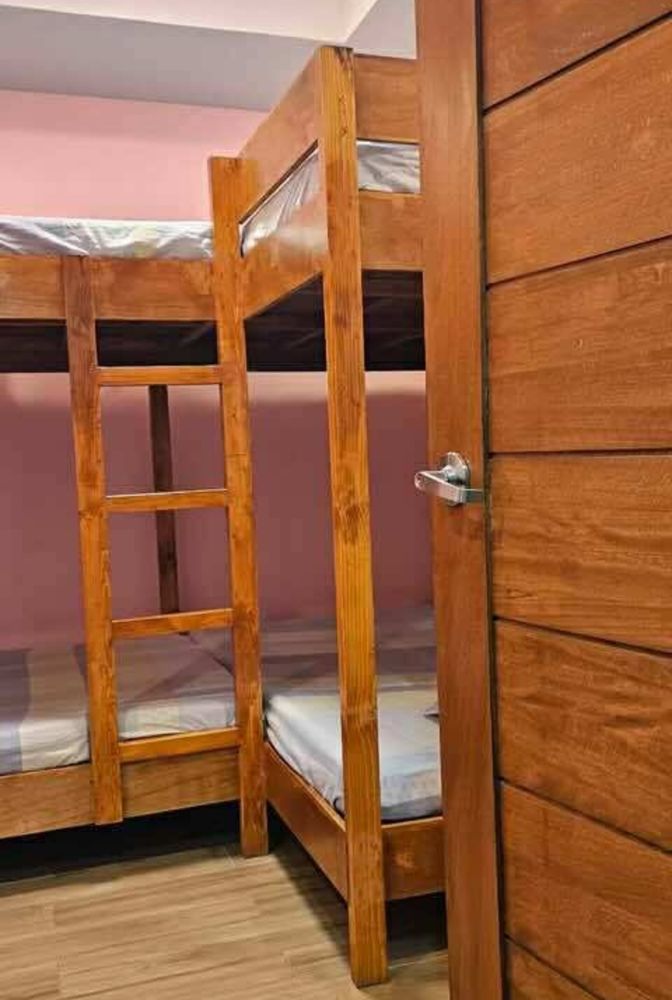 The suite offers one bedroom with an L-type bunk bed, four twin mattresses, and one foldable queen mattress, with pillows and linens provided. The living area provides a comfortable space to unwind, featuring a 43-inch Android TV with Netflix Premium and high-speed Wi-Fi. A dining area with seating for six allows everyone to comfortably enjoy meals together.