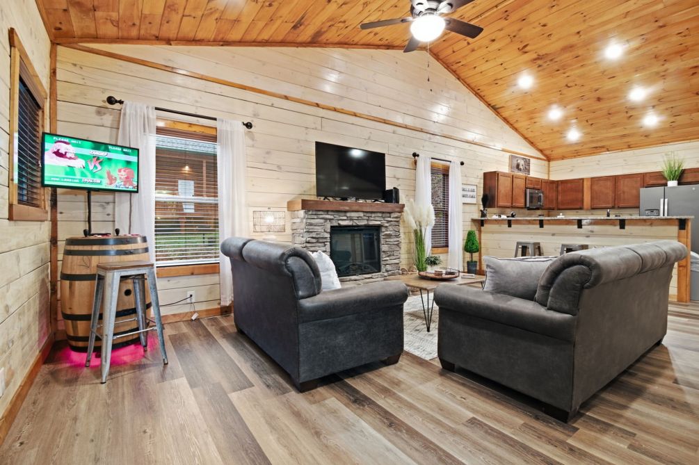 Step inside and immediately feel the warmth of authentic Smoky Mountain craftsmanship. Wood-clad walls, contrasting trim, and a tongue-and-groove cathedral ceiling create an open and inviting atmosphere. The spacious great room features an open floor plan with abundant natural light, a cozy sitting area with a fireplace, a dining area for shared meals, and a fully equipped kitchen, creating the perfect space to relax and unwind.