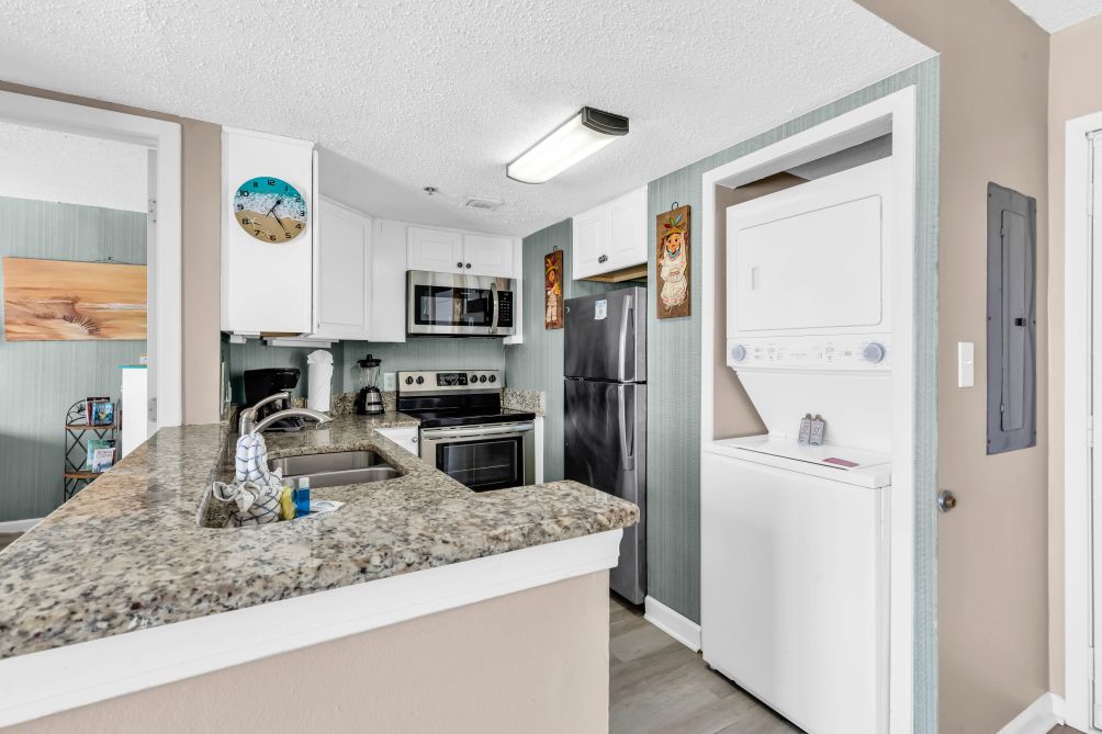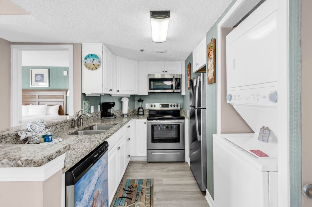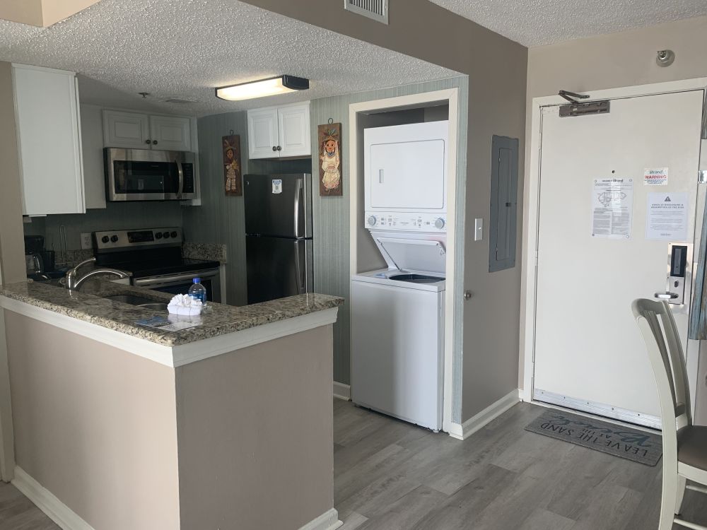 The condo features a private bedroom, a comfortable living area, and all the conveniences of home including an in-unit washer and dryer for added comfort during your stay.