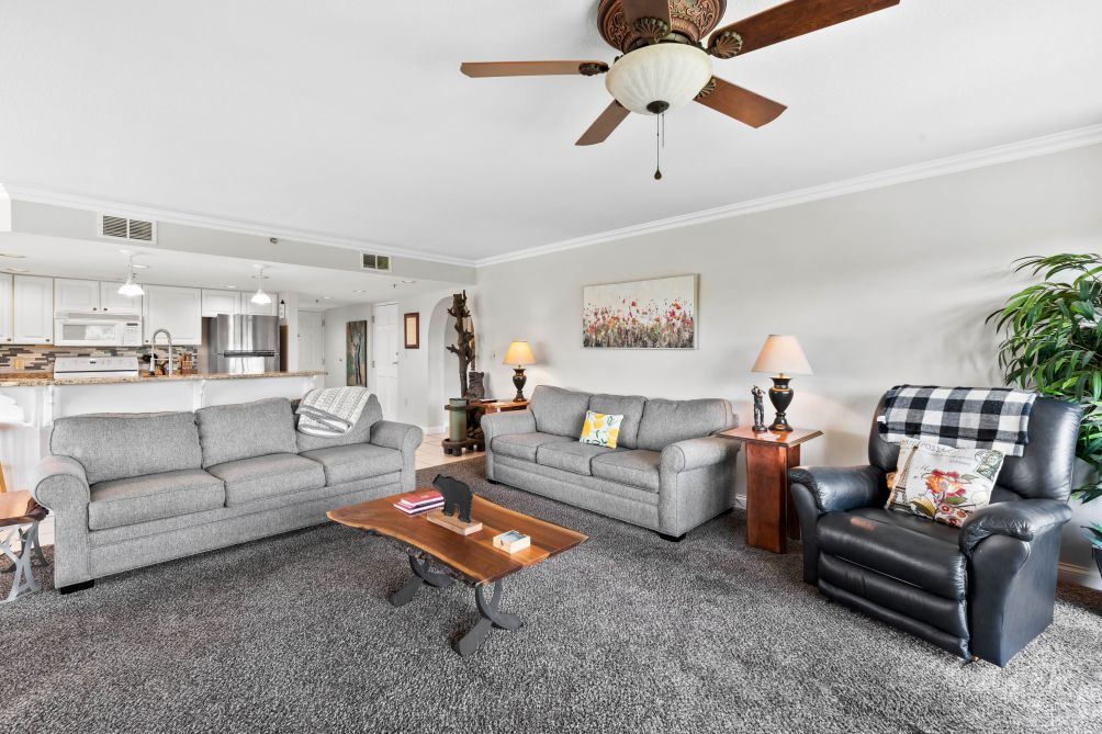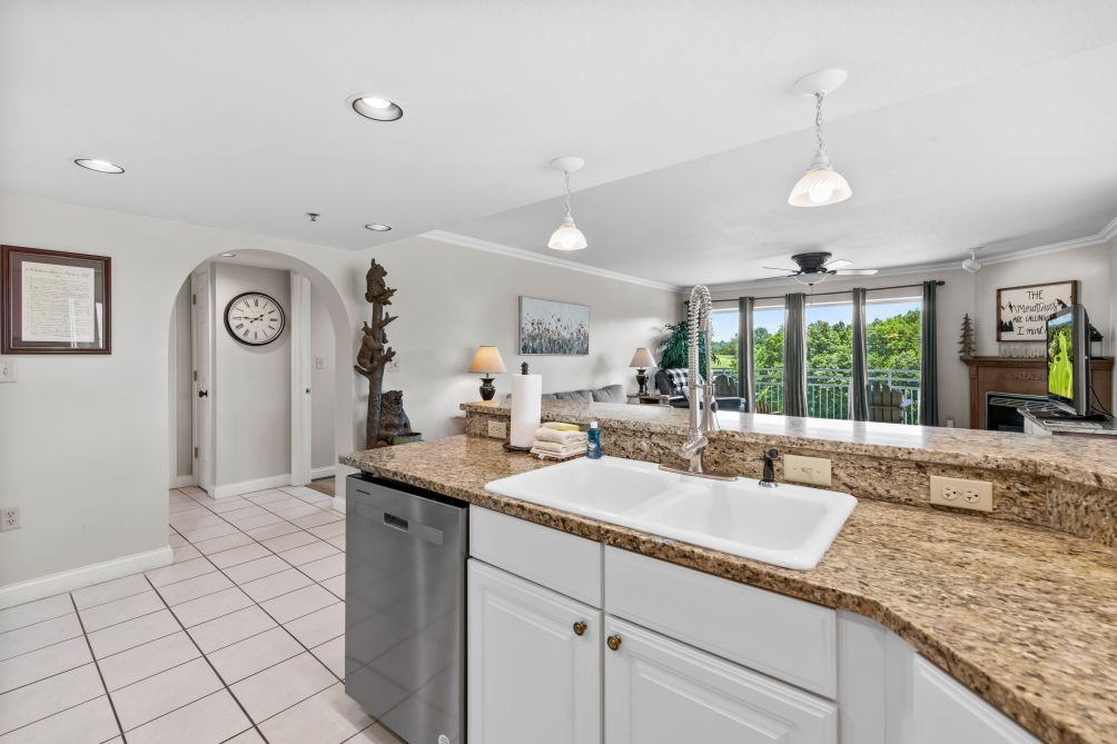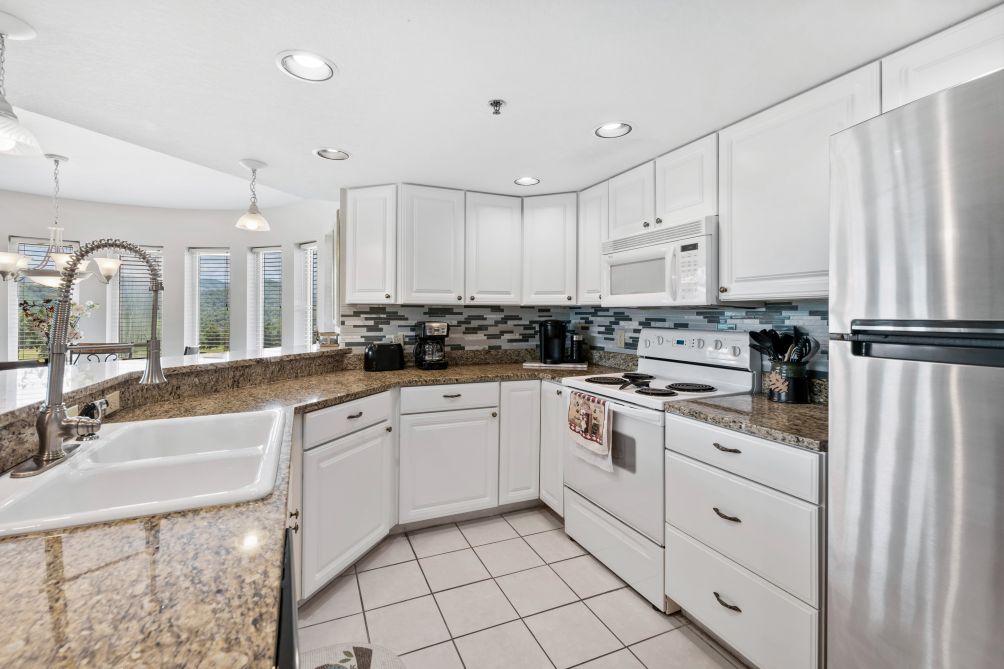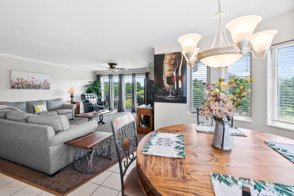 The comfortable living room is perfect for gathering with family or friends and includes a cozy gas fireplace for relaxing evenings. Just steps away, the fully equipped kitchen features granite countertops and full cooking amenities, making it easy to prepare meals during your stay. The adjacent dining area provides plenty of space to enjoy meals together.
