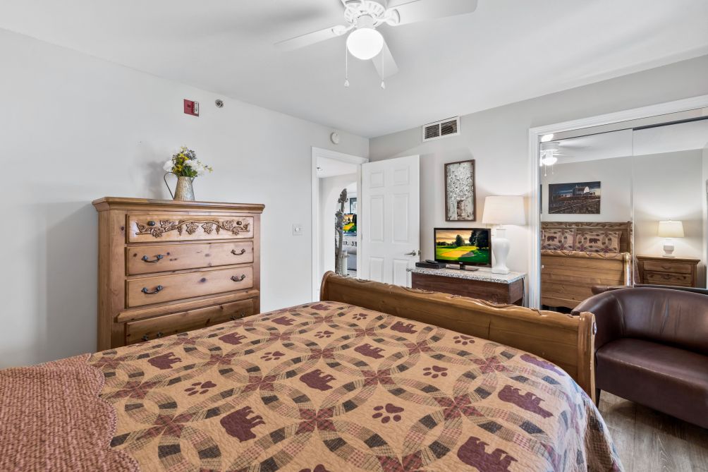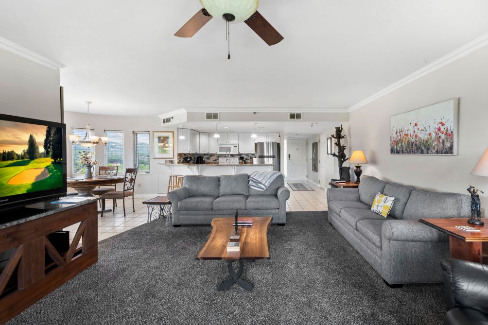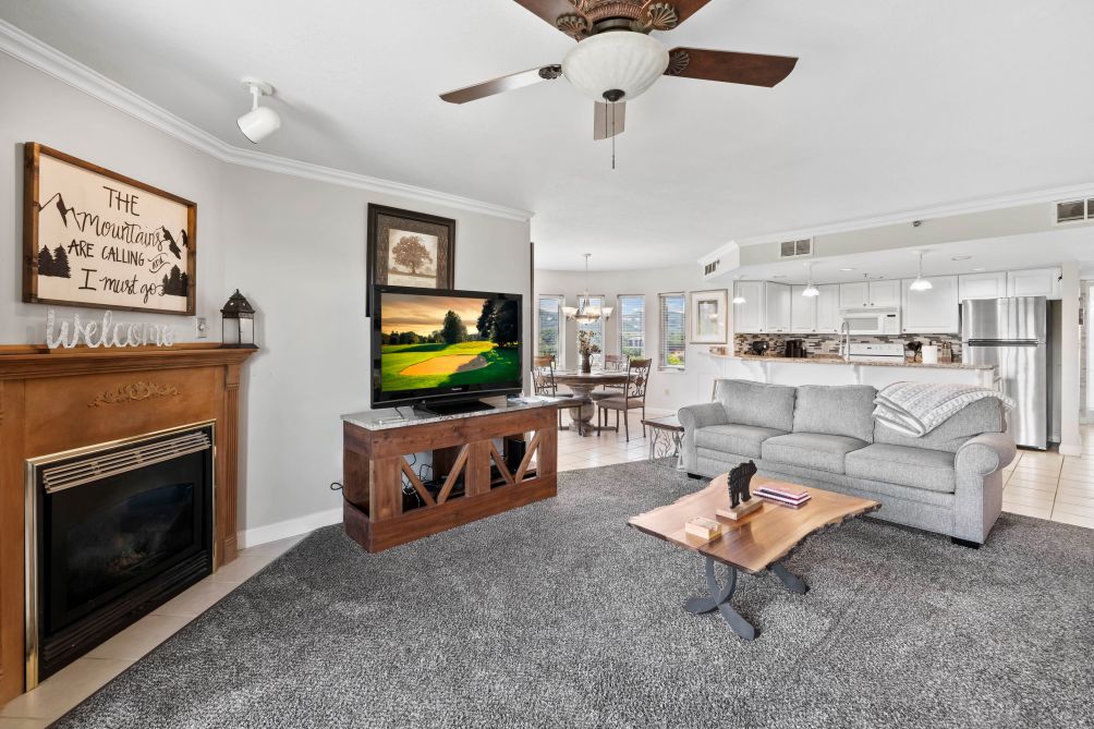 The condo features an open and spacious layout designed for comfort and relaxation. Large windows and the private balcony allow you to take in peaceful views of the surrounding mountains and greens while enjoying your morning coffee or evening sunset.