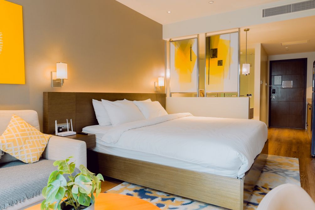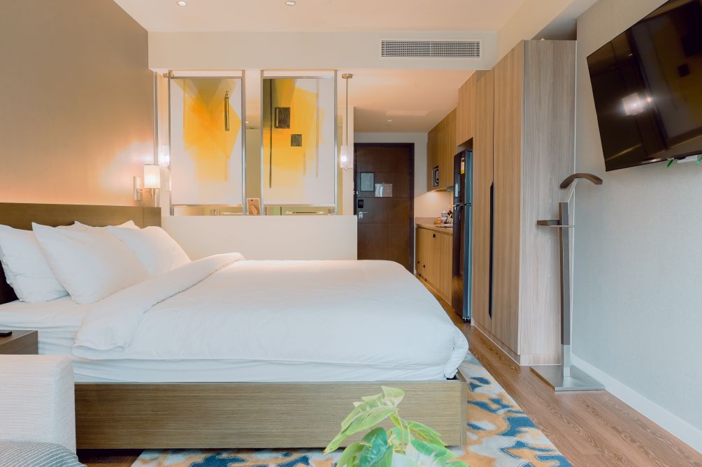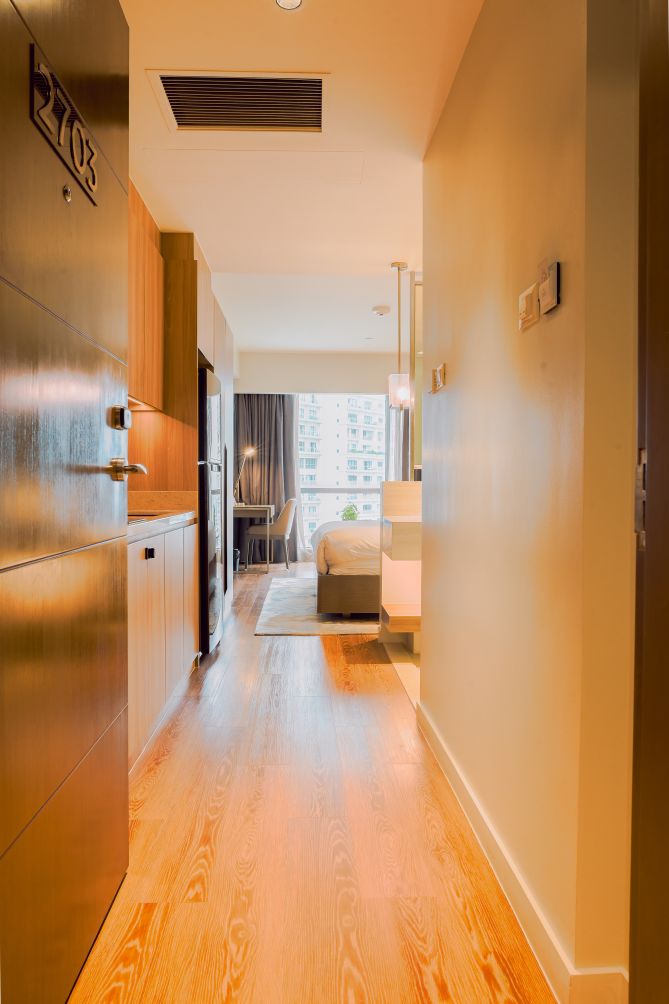 Each suite features well-appointed living spaces, comfortable bedding, and essential amenities to ensure a seamless stay. Guests can enjoy access to premium facilities, including a swimming pool, fitness center, and beautifully landscaped areas ideal for relaxation.